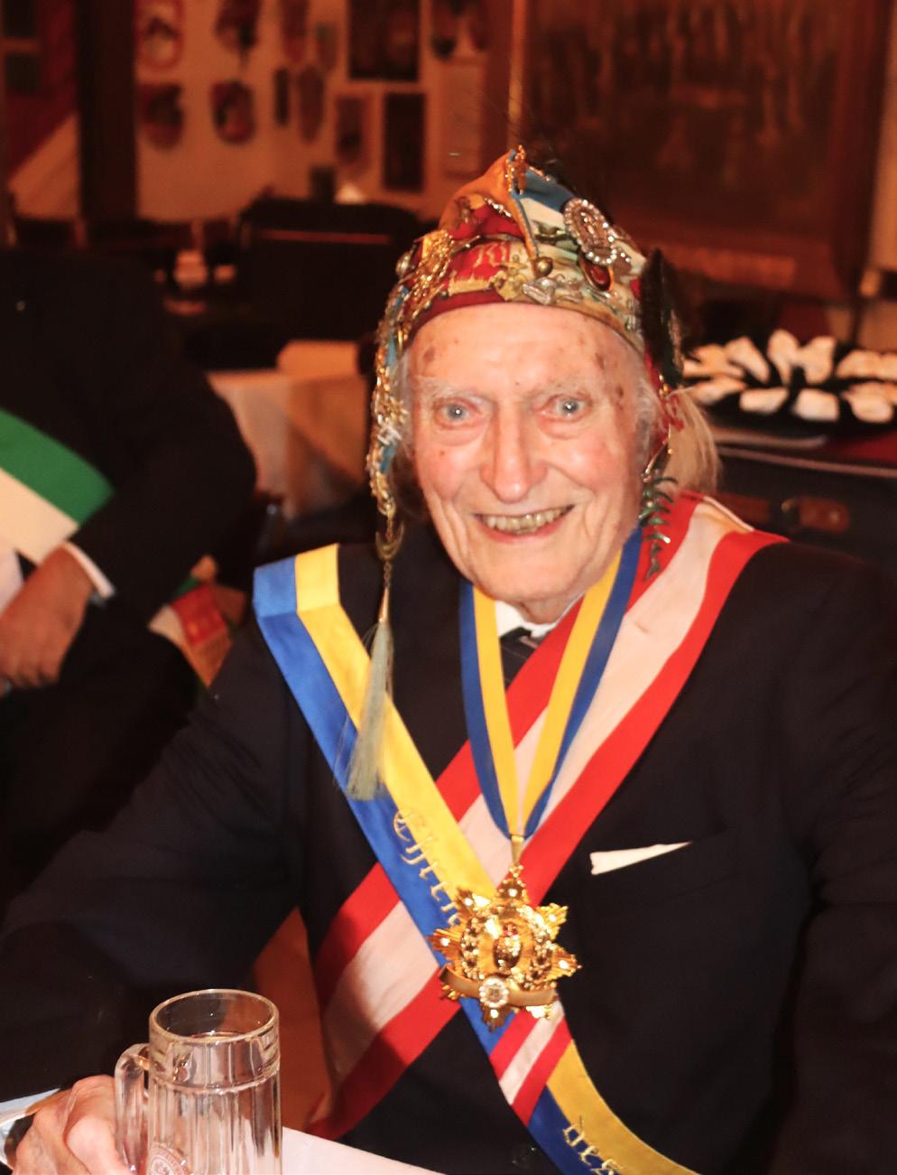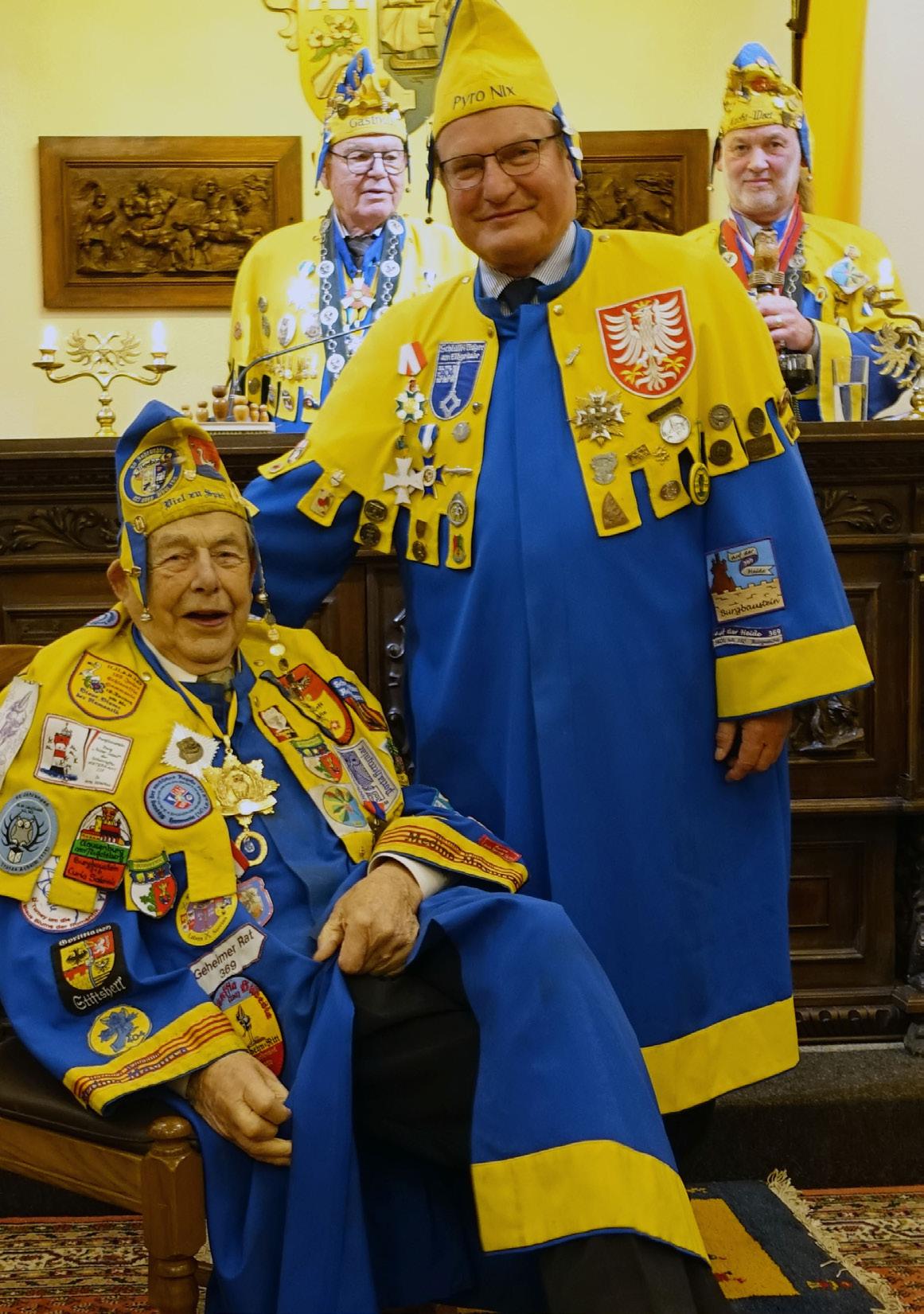 Der 100 jährige Ritter Viel zu Spät, (siehe Foto), der an jedem Sippungsabend einen selbst verfassten Beitrag vorträgt, wird jeden Abend vom Rt Pyronix zur Burg oder zum Besuch zu umliegenden Vereinen mitgenommen. Übrigens, Ritter Viel zu Spät ist erst mit 83 Jahren Schlaraffe geworden. Er empfindet das als viel zu spät. Schlaraffia® hält auch die sehr Alten jung und lebendig. Aber auch die Witwen der verstorbenen Schlaraffen sind nicht vergessen. Zu jedem Burgfrauenabend erhalten sie eine Einladung und ebenso zu den Zusammenkünften in den Sommermonaten, die wir Krystallinen nennen. L.T.