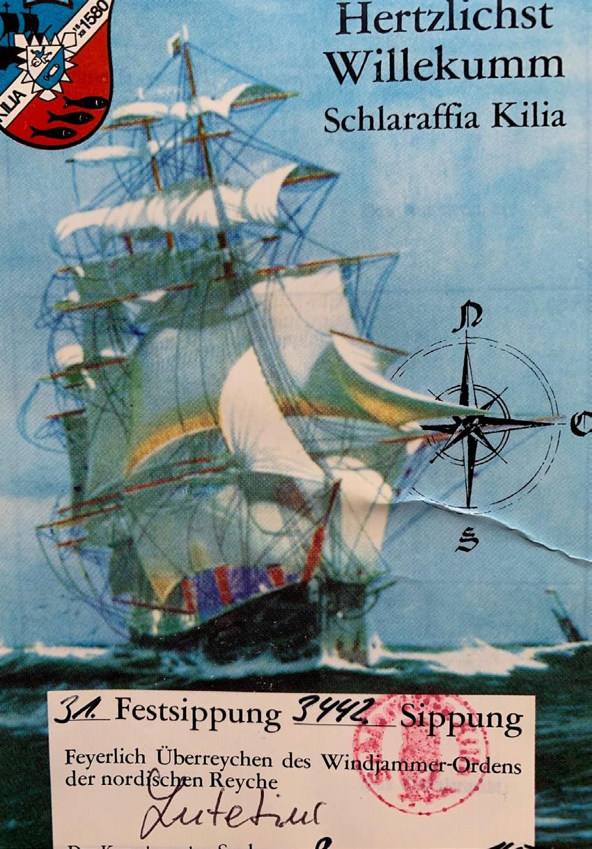 Als ich vor mehr als 40 Jahren Schlaraffe wurde, erhielt ich, wie alle Mitglieder, einen ‚Schlaraffenpass‘, mit meinen Personalien und viel Platz zur Dokumentation meiner Besuche bei anderen schlaraffischen Vereinen. Dabei erhält man nämlich in der Regel einen Einkleber mit dem Datum und auch dem Thema der abendlichen Veranstaltung (Sippung). Schon bald stellte es sich heraus, dass dieser ‚Pass‘ durch die Einkleber zu stark auftrug. Ein Fachmann musste heran – in diesem Fall ein lieber Schlaraffenfreund aus Celle, der Buchbinder war und nun zwischen jede Seite im Rücken einen Streifen klebte, damit mein „Buch“ beim ständigen Anwachsen der eingeklebten Zettel gleichmäßig dick wurde.