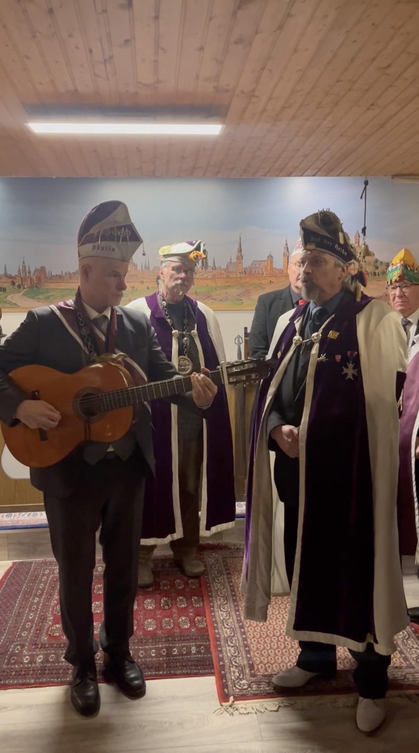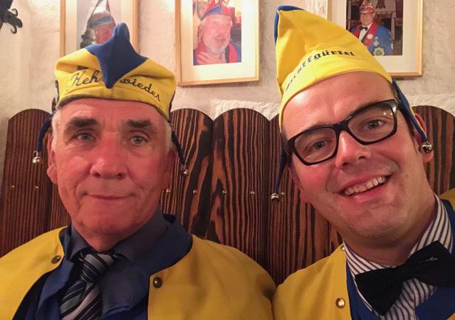 Bild: Zwei Schlaraffen aus dem Reych Am Elbgestade (Stade/404): Der weiland Ritter Kehrwieder (Helmut Kopowski) und sein Sohn, Rt. Straffgürtel (Christoph Kopowski), beim gemeinsamen Einritt in der Hannovera (Hannover/20).