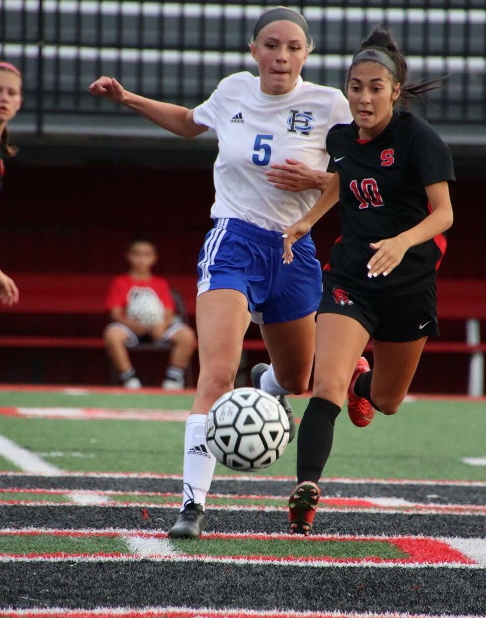 HC’s Jace Madzia controls the ball Gracie Rogers battles with Big Red