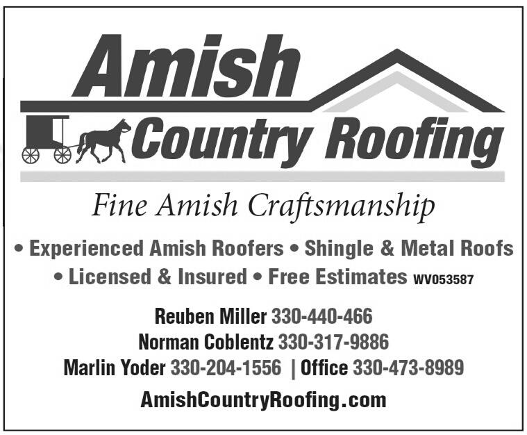 E x p e r i e n c e d A m i s h R o o f e r s S h i n g l e & M e t a l R o o f s L i c e n s e d & I n s u r e d F r e e E s t i m a t e s W V 0 5 3 5 8 7 O f f i c e 3 3 0 - 4 7 3 - 8 9 8 9 M a r l i n M i l l e r 3 3 0 - 2 0 4 - 6 5 7 5 A m i s h C o u n t r y R o o f i n g c o m