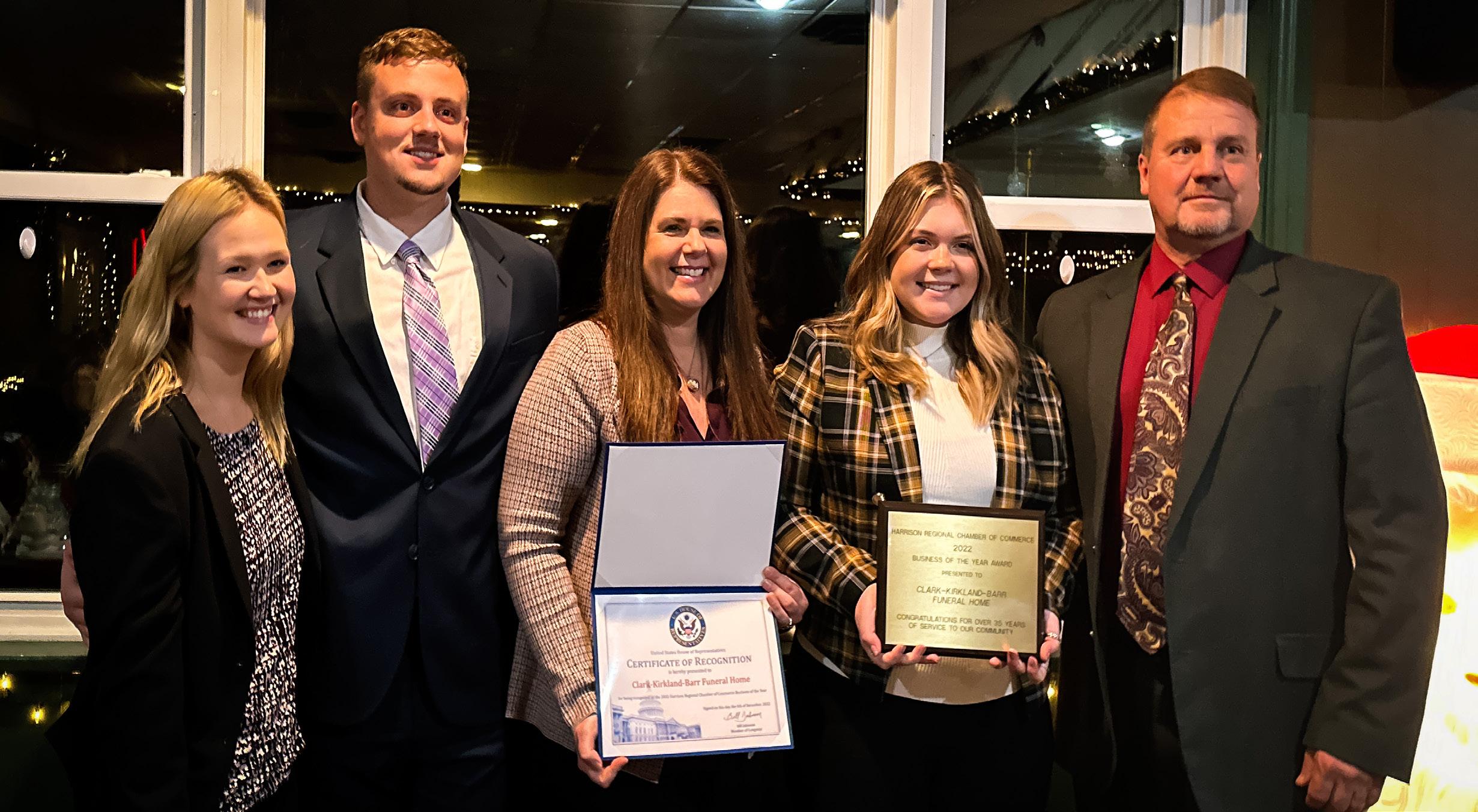 The Barrs accept the business of the year award from the Harrison Regional Chamber of Commerce. From right to left: Allie Cook, Jacob Barr, Alice Barr, Joyce Barr, and Clint Barr. NH PHOTO/TIFFANY BUMGARDNER