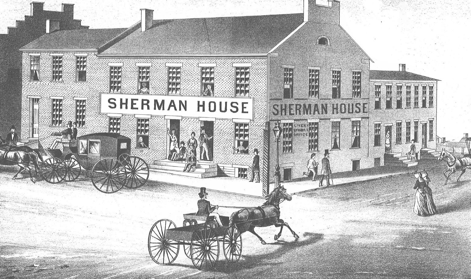 Owners of the Sherman House: 1866 Brown and Dewey; 1868 William G. Thompson; 1870 Henry Glass; 1874 Matilda S. Atkinson; 1876 Silas W. Gard and 1876 David B. Welch.