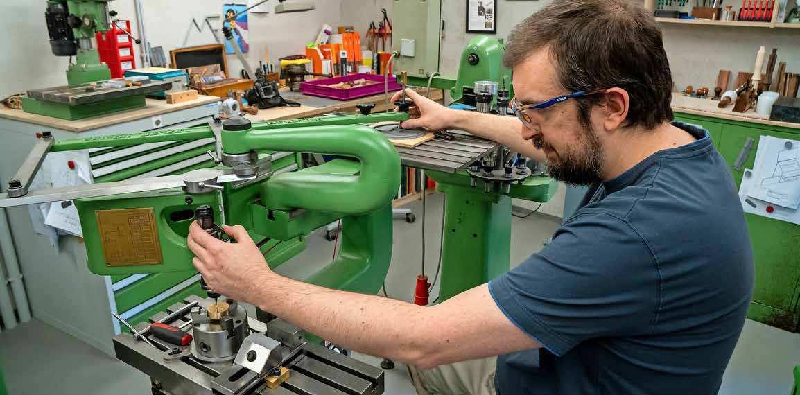 Matthias Fenner an einem Pantographen. Mit dieser Kopierfräse stellt er Brandstempel her.