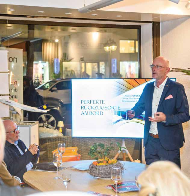 Eine virtuelle Reise auf die luxuriöse Flotte von Explora Journeys Hans-Joachim Bischoff, Gastgeber des Abends, begrüßte die illustren Gäste mit Charme und persönlicher Wärme und stimmte sein Publikum auf einen Abend ein, der ihnen die Welt näherbringen würde. Dann betrat Daniel Zink von Explora Journeys die Bühne des Abends. Er entführte die Gäste auf eine virtuelle Reise durch die luxuriöse Flotte von MSC, die ihresgleichen sucht. Großzügige Suiten, in denen Entspannung und Eleganz aufeinandertreffen, wurden in Bildern lebendig, und die Gäste ließen sich von der Vorstellung tragen, wie es wäre, in diesen Oasen des Luxus die Zeit zu vergessen. Ein Hauch von Fernweh, gepaart mit dem Traum vom perfekten Moment, lag in der Luft.