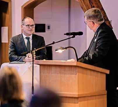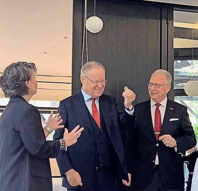 „SiekennenunsereSpracheund unseren Takt“: Mit diesen Worten überreichte Mike Schneider, Präsident des Niedersächsischen Handwerkstags (NHT), den Ehrenring an StephanWeil. InseinerLaudatiodankteerdem NiedersächsischenMinisterpräsidenta.D.fürseinenEinsatzfür das Handwerk während seiner zwölfjährigenAmtszeit.Eshabe immer Gespräche auf Augenhöhe gegeben. Man habe sich gegenseitig Respekt und Wertschätzung entgegengebracht. Beispielhaft für zahlreiche Meilensteine in Weils Amtszeit nannte Schneider: