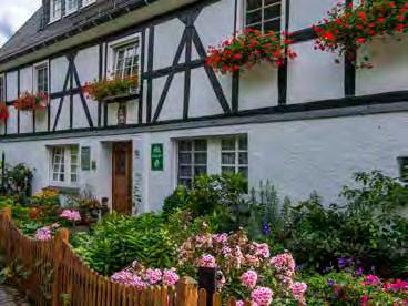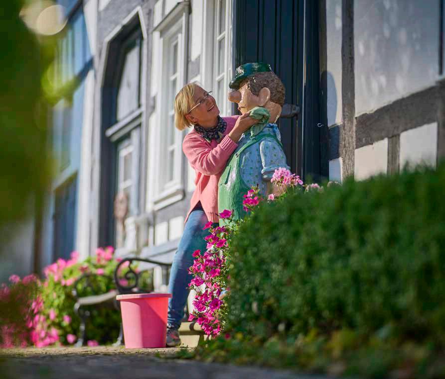 Wichtig ist für den Landschaftsgärtner, dass der Garten zum Haus passt, besonders hier in der Region, deren Erscheinungsbild von den gepflegten Fachwerkhäusern mit ihren typischen, kleinen Vorgärten geprägt ist. Davor einen mediterranen Garten anzulegen – da würde er sich glatt weigern. In Grafschaft steht Thorsten gerade vor einem besonders schönen Exemplar: Kletterrosen, Rittersporn, Hortensien, Tränendes Herz und Frauenmantel blühen in üppiger Fülle, samtige Zwetschgen hängen vom Baum, Kräuter- und Gemüsebeete sind von Buchsbaumhecken eingefasst. Dahinter ist die historische Hausfassade zu sehen und eine Sitzbank an der Wand, die gehört unbedingt zum Ensemble. „Das sind Gesamtkunstwerke. Und das Bänkchen braucht es, damit sich die Leute abends oder am Wochenende auf einen Kaffee oder ein Bier treffen können, das war schon früher so.“