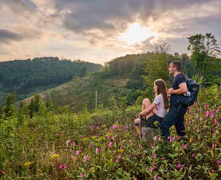 Zum Sonnenaufgang auf den Gipfel wandern oder eine entspannte Abendrunde im Tal drehen - die Region bietet viele Wege zum Schauen, Lauschen, Riechen und Fühlen. Währenddessen kannst du dir Zeit nehmen, die Natur zu genießen: Im Frühling dem Konzert der Vögel lauschen, im Sommer durch den schattigen Wald spazieren, im Herbst und im Winter mit oder ohne Schnee die weiten Aussichten in die Hügelmeere bewundern.