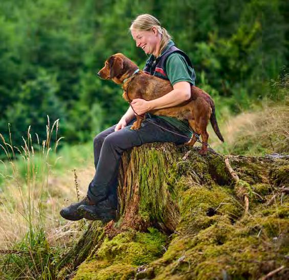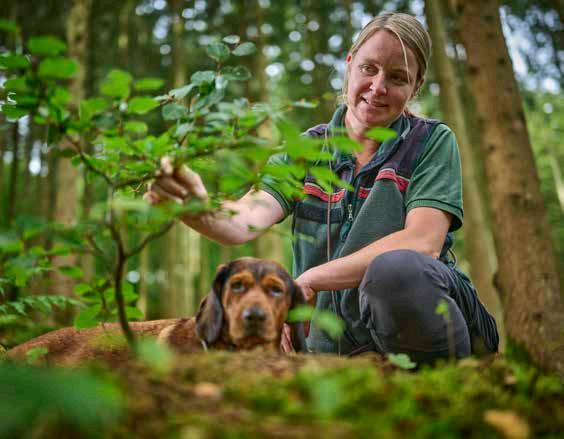 Die Mischwälder machen die Gebiete des Stadtwaldes nicht nur ökologisch wertvoll, sondern auch zu besonders lebendigen Erholungsräumen. Alle paar Meter gibt es etwas Neues zu entdecken: Die unterschiedlichen Wachstumsstadien vom Sämling bis zum Baumriesen zum Beispiel oder wie Fingerhut, Ginster und Himbeersträucher die Freiflächen erobern und den kleinen Bäumen Schutz bieten. Eine eigene Welt, deren Sprache zu lesen Lisa Feldmann-Schüttes Aufgabe ist. Besonders gern mag sie jedoch die Zeit der Holzernte im Herbst und Winter, wenn die Bäume in der Ruhephase sind. Dabei läuft sie durch den Wald und markiert die Stämme, die als nächstes geerntet werden. Alma findet das eher semi-spannend, viel lieber wäre sie mit Frauchen auf der Jagd, übrigens auch eine Aufgabe und gleichzeitig ein Hobby der Försterin.