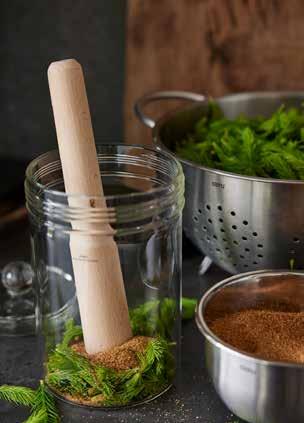 - Die erste Schicht Fichtenspitzen mit dem Stößel in dem Fermentierglas festdrücken.