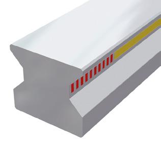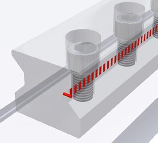 (Fig. 12) Il profilo trapezoidale delle rotaie ha permesso di ottimizzare le sezioni trasversali dei carrelli, nonché il collegamento tra superficie di base della guida e sottostruttura, onde ottenere la maggior rigidità possibile. Tale profilo consente una manutenzione semplice, poiché le guarnizioni tergipista supplementari possono essere sostituite direttamente sulla guida stessa, senza dover procedere ad un complicato smontaggio del carro.