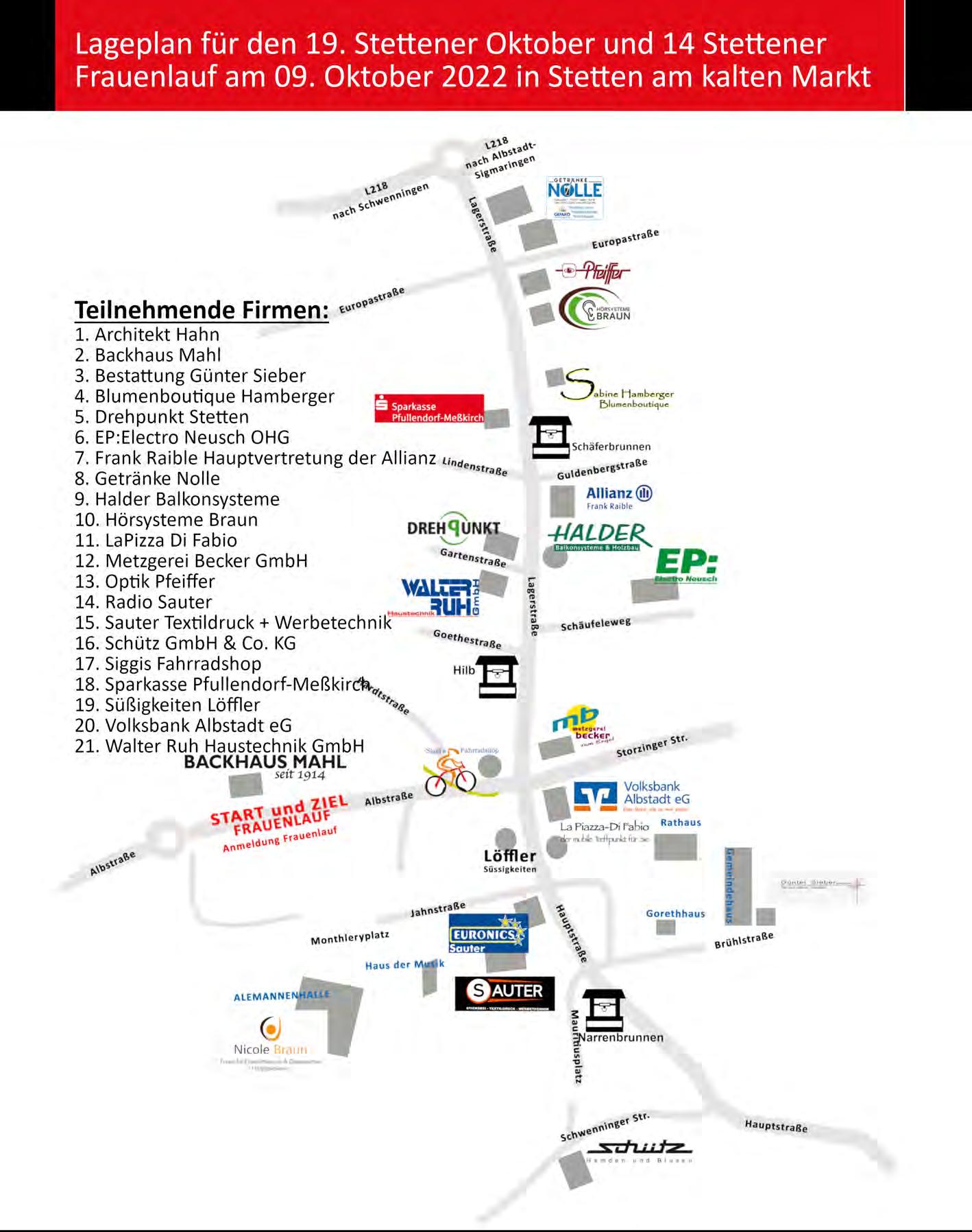 Veranstalter:Wirtschaftsverbund Stetten a.k.M. TSV Stetten a.k.M. Sportliche Leitung:Jürgen Klaus Veranstaltungstag:Sonntag, 09. Oktober 2022 Start / Ziel:Albstraße beim Knusperhäusle Startzeit: 10:30 Uhr gemeinsamer Start aller Disziplinen Sonderwertung / -preis: Größte Gruppe Paar-Generationen-Wertung innerhalb einer Disziplin (schnellstes Paar) Jugendwertung bis einschl. 2007 Siegerehrung:Im Anschluss ca. 12:30 Uhr im Start-Zielbereich, bei schlechter Witterung im Schulgebäude Für die Plätze 1-5 gibt es Urkunden Strecken: Wahlweise 5 oder 10 Kilometer Walking / Nordic Walking oder Laufen (Jogging) T-Shirt: Jede vorangemeldete Teilnehmerin bekommt ein T-Shirt und eine Finishertasche Startgeld: 15,-€ per Bankeinzug Auskunft / Info:Jürgen Klaus E-Mail: info@stettener-frauenlauf.de Anmeldeschluss:01.10.2022 (mit T-Shirt Anspruch) Nachmeldungen:07.10.2022 bis 12:00 Uhr (ohne T-Shirt Anspruch) Startnummern-Ausgabe: Sonntag, 09. Oktober 2022 von 8:30 Uhr - 10:00 Uhr im Schulgebäude Eingang Albstraße / Knusperhäusle Umkleiden:Alemannenhalle Stetten Online-Anmeldung:www.stettener-frauenlauf.de Die Teilnahmebedingungen, sowie die Hinweise zum Datenschutz können Sie auf www.stettener-frauenlauf.de einsehen. Alle Informationen zum Frauenlauf auf einen Blick Frauenlauf - WIRTSCHAFTSVERBUND Stetten AM KALTEN MARKT e.V.