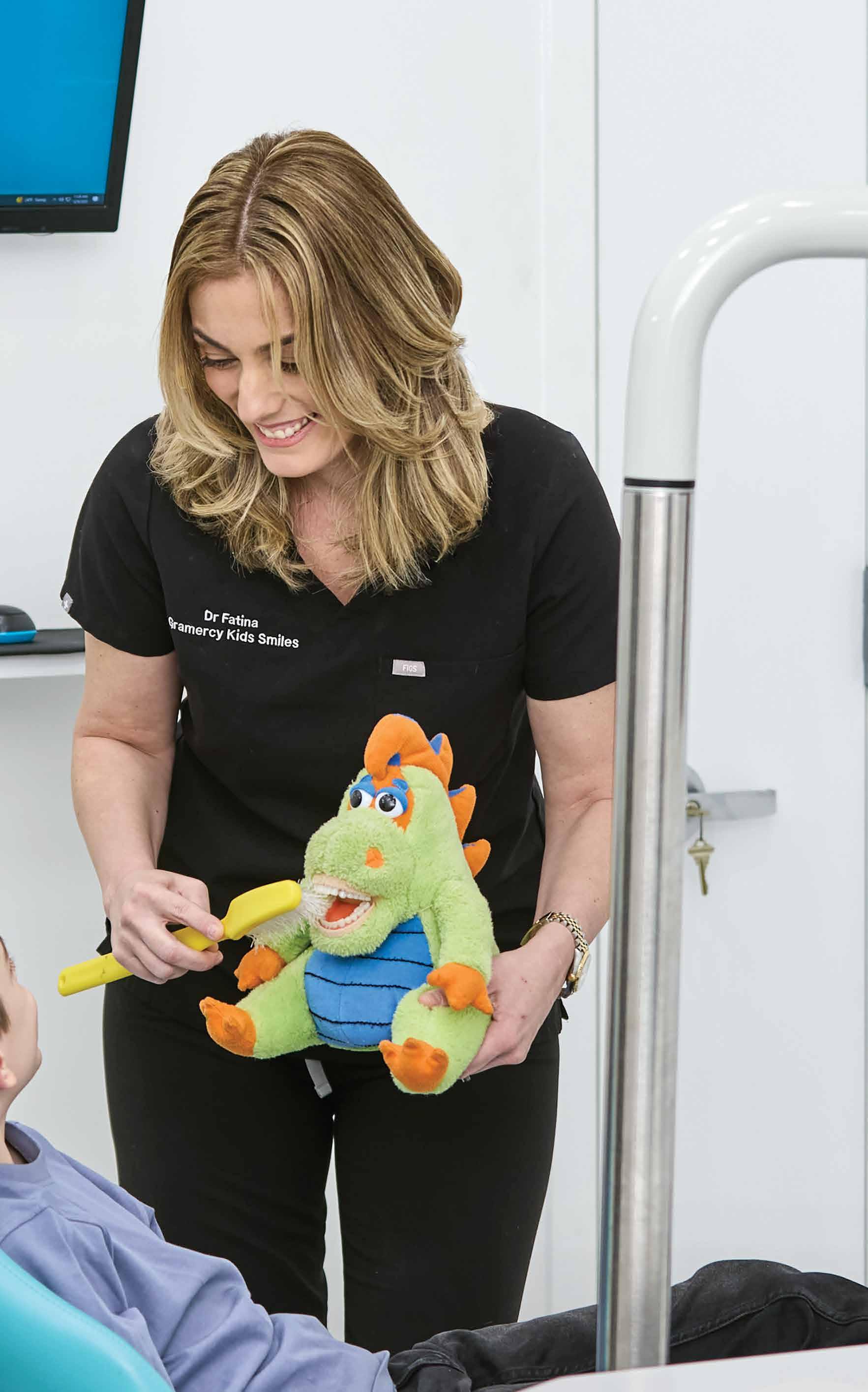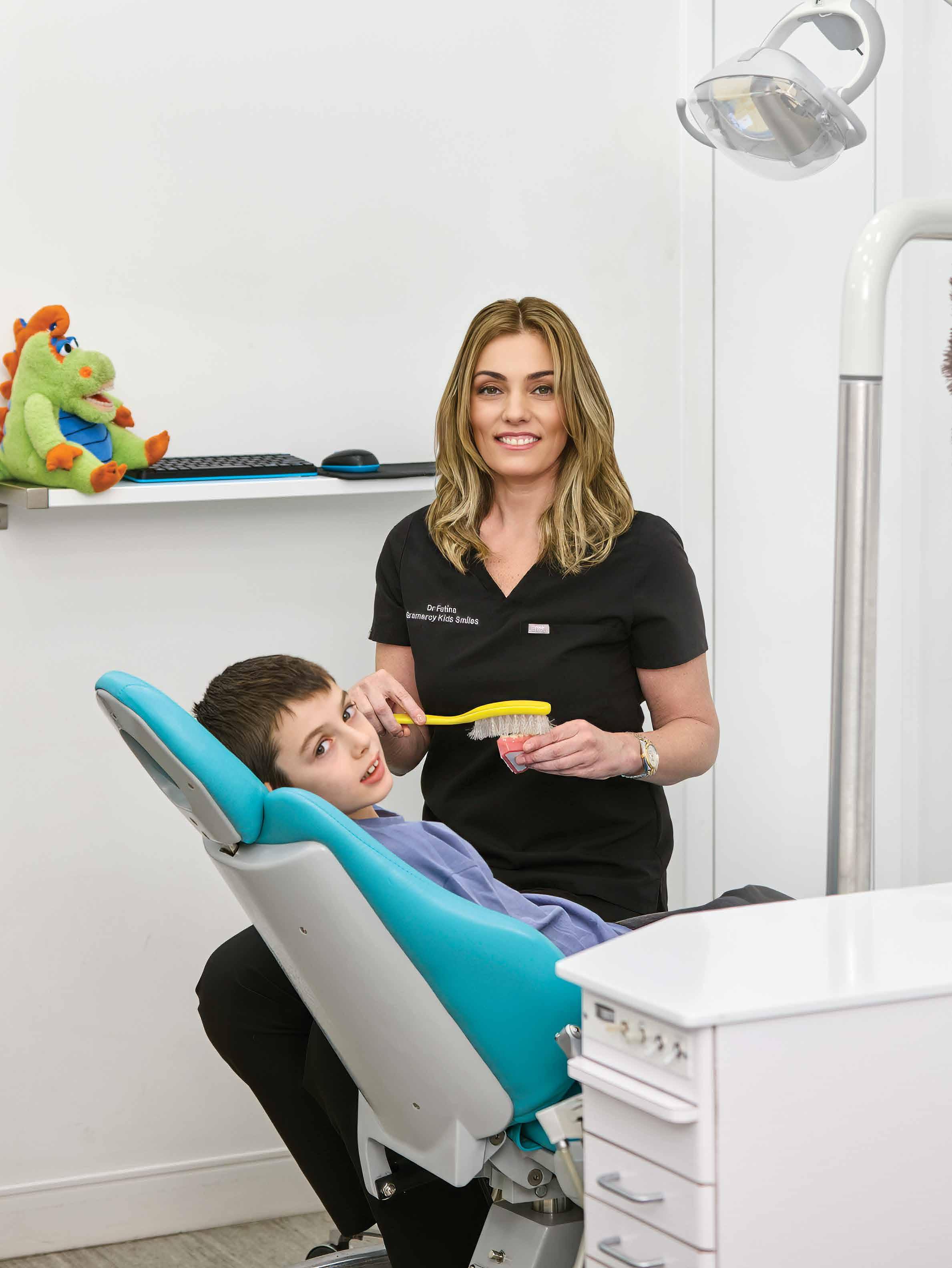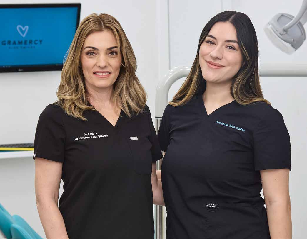 confidence—not just straight teeth. We are also lucky to have orthodontic care as well, with husband and partner Dr. Jason Berk. Another big appeal for parents is Gramercy Kids Smiles’ focus on education, a core part of the practice. “Our philosophy is very preventative-based and we really value education,” Dr. Fatina shares. “We’re