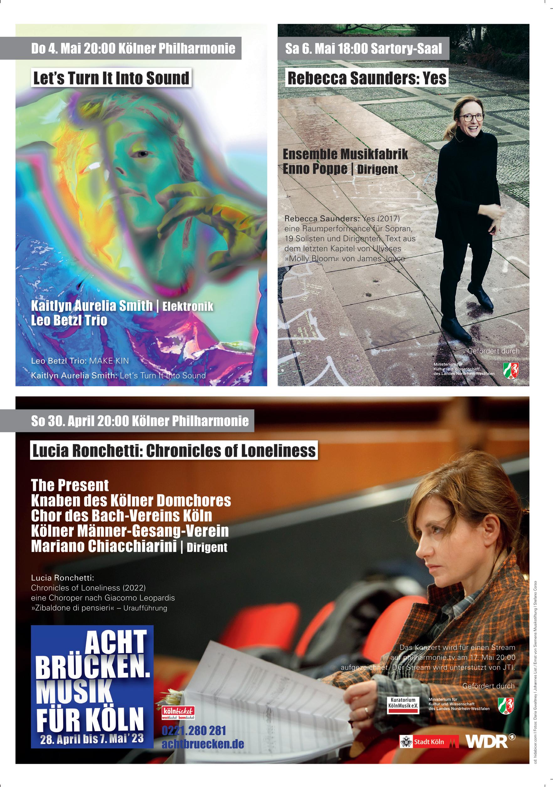Heute: »Lucia Ronchetti: Chronicles of Loneliness« - Eine Choropernach Giacomo Leopardis »Zibaldone di pensieri«. Eintritt: VVK29,-/18,- D Philharmonie Köln, Bischofsgartenstr. 1