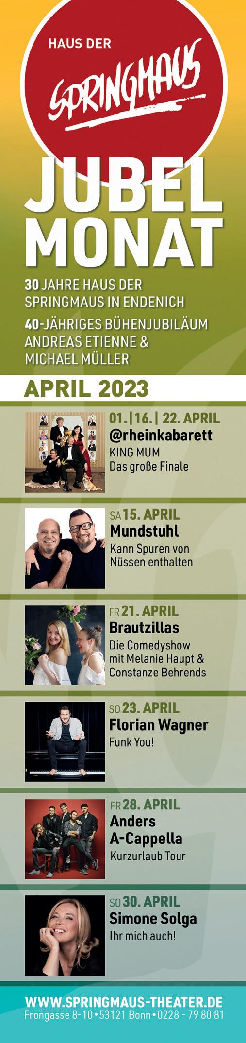 Genau zehn Jahre später eröffnete am 1.April 1993 schließlich das heutige Haus der Springmaus in Endenich.Zunächst hatte die Springmaus ab 1985 in einem Keller an der Oxfordstraße ihr Zuhause.Heute gehört das Theater an der Endenicher Kulturmeile längst zu den bedeutendsten Kabarett- und Kleinkunstbühne der Republik.