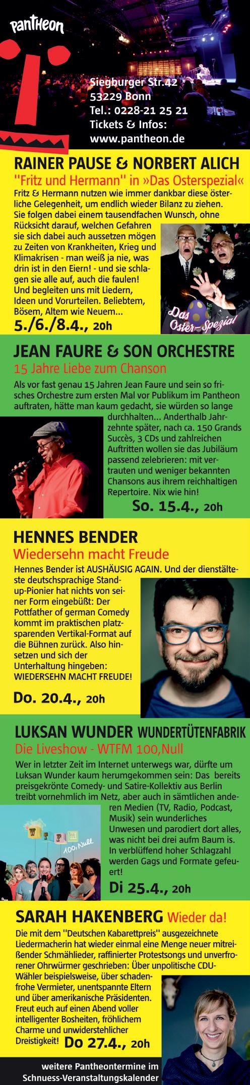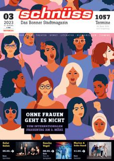 erscheintam 26.04. Redaktionsschluss 12.04. Tageskalender 12.04. Anzeigenschluss 12.04. Kleinanzeigenschluss 12.04. Die SCHNÜSS erscheintmonatlich. Bezug perAbo, 12 Ausgaben: 18,– EUR (incl. MWSt+ Porto)
