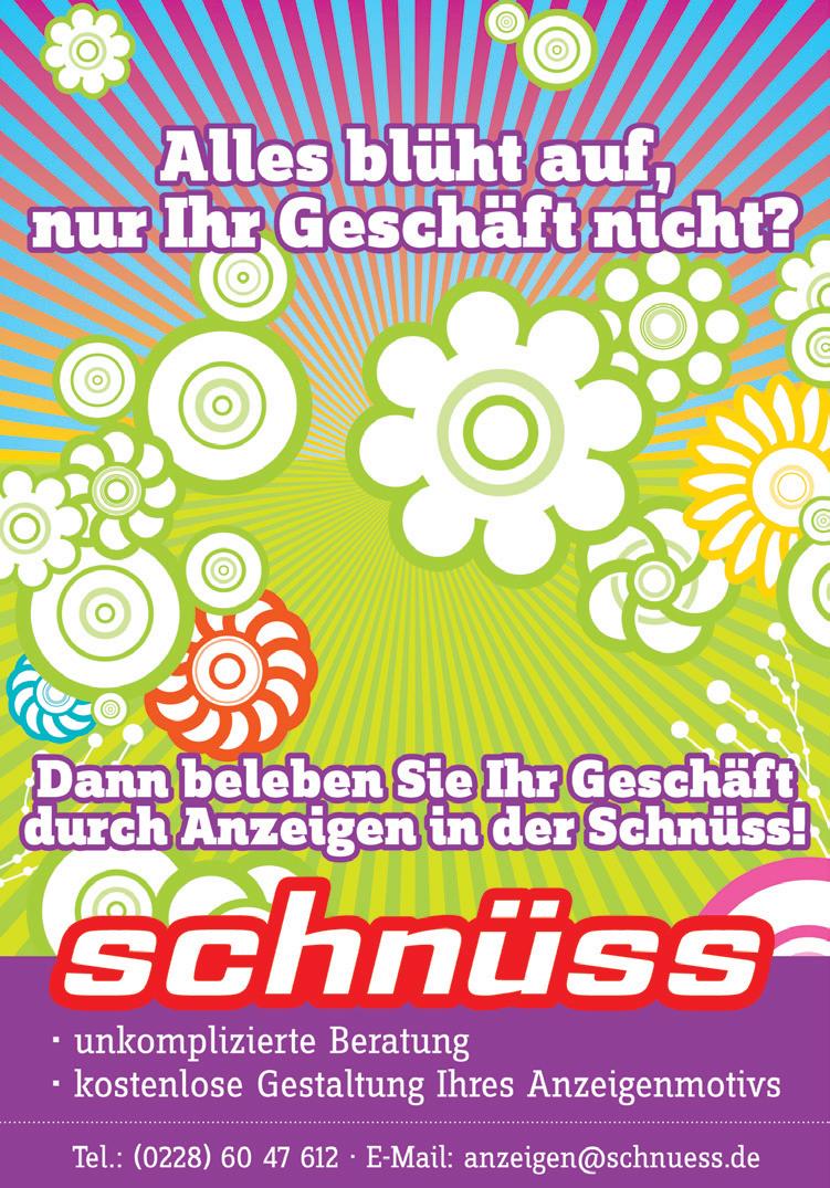Kleinanzeigen: - 19 Internet:www.schnuess.de E-Mail: redaktion@schnuess.de tageskalender@schnuess.de verlosungen@schnuess.de kleinanzeigen@schnuess.de abo@schnuess.de anzeigen@schnuess.de