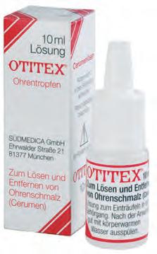 Anwendungsgebiete: Zur Erweichung von verhärtetem Ohrenschmalz. Cerumenlöser vor ärztlicher Ohrenuntersuchung und vor örtlicher medikamentöser Ohrenbehandlung. Otitex ist gut geeignet zur Sauberhaltung desGehörganges bei Hörgeräteträgern.