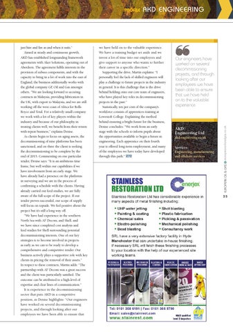 just hire and fire as and when it suits.” Aimed at steady and continuous growth, AKD has established longstanding framework agreements with Aker Solutions, operating out of Aberdeen. The agreement fulfils interests in the provision of subsea components, and with the capacity to bring in a lot of work into the east of England, the business additionally works with the global company GE Oil and Gas amongst others. “We are looking forward to securing contracts in Malaysia, providing fabrication in the UK, with export to Malaysia, and we are still working off the west coast of Africa for Rolls Royce and Total. For a relatively small company we work with a lot of key players within the industry and because of our philosophy in treating clients well, we benefit from their return with repeat business,” explains Denise. As clients begin to focus on aging assets, the decommissioning of nine platforms has been sanctioned, and on three the client is seeking the decommissioning to be complete by the end of 2015. Commenting on one particular tender, Denise says: “It is an ambitious time frame, but well within our capabilities if we have involvement from an early stage. We have already had a presence on the platforms in surveying and we are in the process of confirming a schedule with the clients. Having already carried out feed studies, we are fully aware of the full scope of the project. If our tender proves successful, our scope of supply will focus on topside. We feel positive about the project but it’s still a long way off. “We have had experience in the southern North Sea with AF Decom, and Shell, and we have since completed cost analysis and feed studies for Shell surrounding potential decommissioning interests. One of our key strategies is to become involved in projects as early as we can to be ready to develop a comprehensive and competitive tender. Our business actively plays a supportive role with key clients in pricing the removal of their assets.” In respect to these contracts, Martin adds: “The partnership with AF Decom was a great success and the client was particularly satisfied. The outcome can be attributed to a high-level of expertise and clear lines of communication.” It is experience in the decommissioning sector that puts AKD in a competitive position, as Denise highlights: “Our engineers have worked on several decommissioning projects, and through looking after our employees we have been able to ensure that