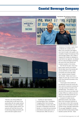 renaissance of innovation, largely driven by relatively new suppliers such as Mike’s Hard Lemonade, New Belgium and a host of smaller craft suppliers, has completely changed the landscape of the adult beverage category. CBC’s ability to recognize this change and willingness to invest behind new segments, has allowed the firm to take advantage by partnering with some of the most visionary and innovative suppliers in the industry. “Over the last five years, many of our great supplier partners have entered into the seltzer side of the business and we have partnered up with a couple of innovative new brands like White Claw,” explains company President Tee Nunnelee. “Seltzer wasn’t even a category five years ago, but now it is one of the more dominant sub-sectors in the whole industry. “I have to give a lot of credit to all the distributors around the country who have made the investments necessary to encourage continued innovation in the beverage sector,” Tee continues. “I am also proud of the way we are always able to adapt. Without our ability to pivot and adjust and make these brands work, we wouldn’t be as successful as we are.” A recipient of multiple industry performance awards, most recently Mike’s Hard Lemonade’s Distributor of the Year Award in 2019, CBC’s enduring appeal is driven by its ability to build and maintain strong, meaningful relationships. This was again highlighted in January when local North Carolina brewery NoDa decided to partner with CBC. “NoDa