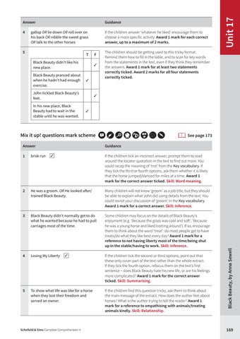 Some children may focus on the details of Black Beauty’s enjoyment (e.g. ‘Because the grass was cool and soft’; ‘Because he was a young horse and liked trotting around’). If so, encourage them to think about the word ‘treat’: do most people get to have treats/do what they like best every day? Award 1 mark for a reference to not having liberty most of the time/being shut up in the stable/having to work. Skill: Inference.