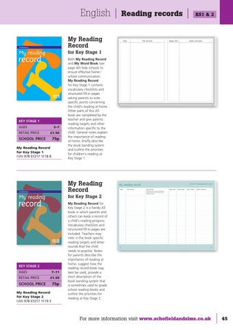 Both My Reading Record and My Word Book (see page 40) help schools to ensure effective home– school communication� My Reading Record for Key Stage 1 contains vocabulary checklists and structured fill-in pages asking parents to note specific points concerning the child’s reading at home� Other parts of this A5 book are completed by the teacher and give parents reading targets and other information specific to the child� General notes explain the importance of reading at home, briefly describe the book banding system and outline the priorities for children’s reading at Key Stage 1�