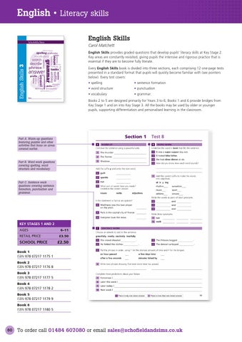 English • Literacy skills English Skills Carol Matchett English Skills provides graded questions that develop pupils’ literacy skills at Key Stage 2. Key areas are constantly revisited, giving pupils the intensive and rigorous practice that is essential if they are to become fully literate. Every English Skills book is divided into three sections, each comprising 12 one-page tests presented in a standard format that pupils will quickly become familiar with (see pointers below). Every test covers: • spelling