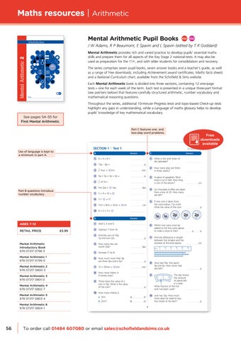 J W Adams, R P Beaumont, E Spavin and L Spavin (edited by T R Goddard) Mental Arithmetic provides rich and varied practice to develop pupils’ essential maths skills and prepare them for all aspects of the Key Stage 2 national tests. It may also be used as preparation for the 11+, and with older students for consolidation and recovery. The series comprises seven pupil books, seven answer books and a teacher’s guide, as well as a range of free downloads, including Achievement award certificates, Maths facts sheets and a National Curriculum chart, available from the Schofield & Sims website. Each Mental Arithmetic book is divided into three sections, containing 12 one-page tests – one for each week of the term. Each test is presented in a unique three-part format (see pointers below) that features carefully structured arithmetic, number vocabulary and mathematical reasoning questions. Throughout the series, additional 10-minute Progress tests and topic-based Check-up tests highlight any gaps in understanding, while a Language of maths glossary helps to develop pupils’ knowledge of key mathematical vocabulary. See pages 54–55 for First Mental Arithmetic. Part C features one- and two-step word problems.