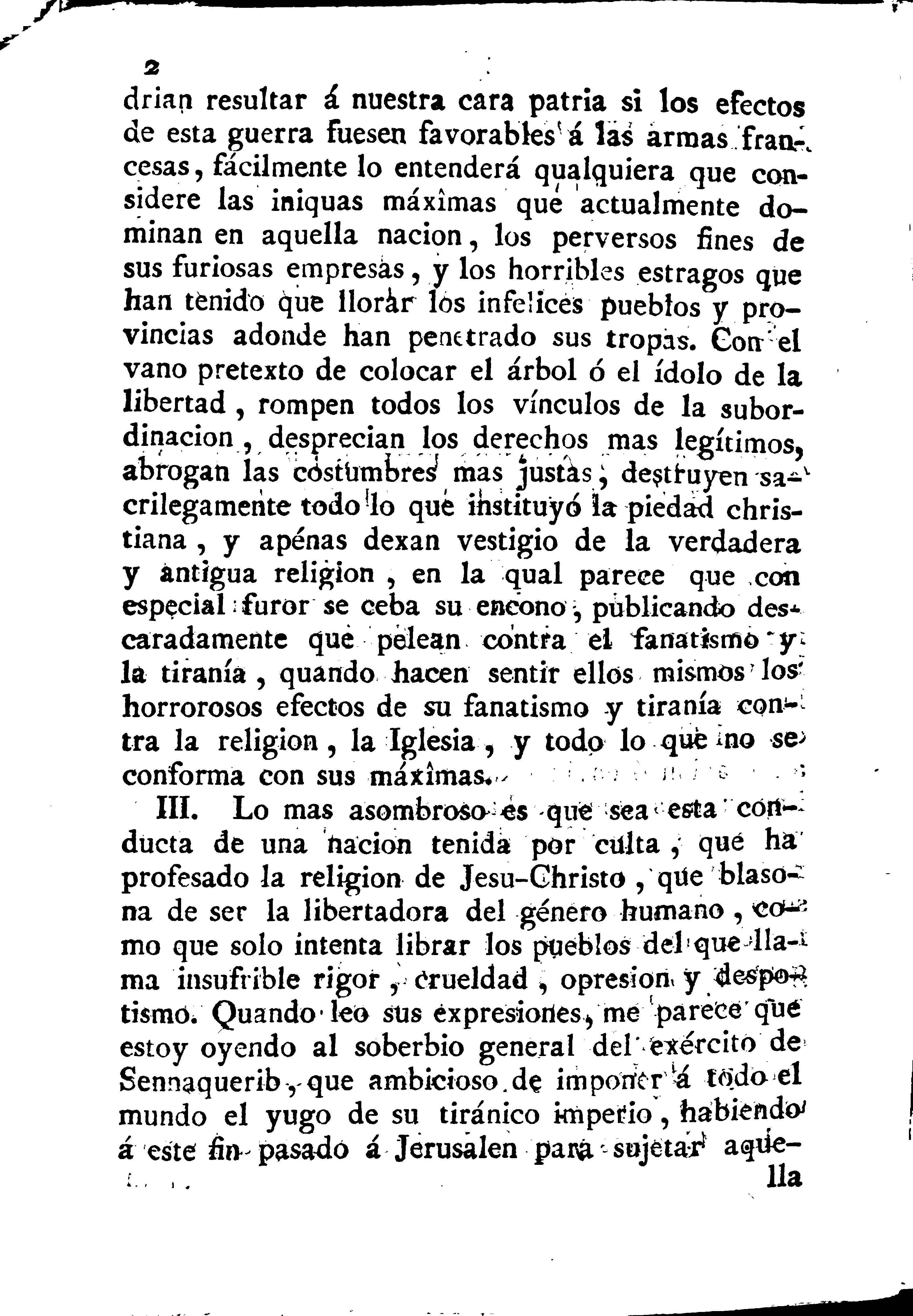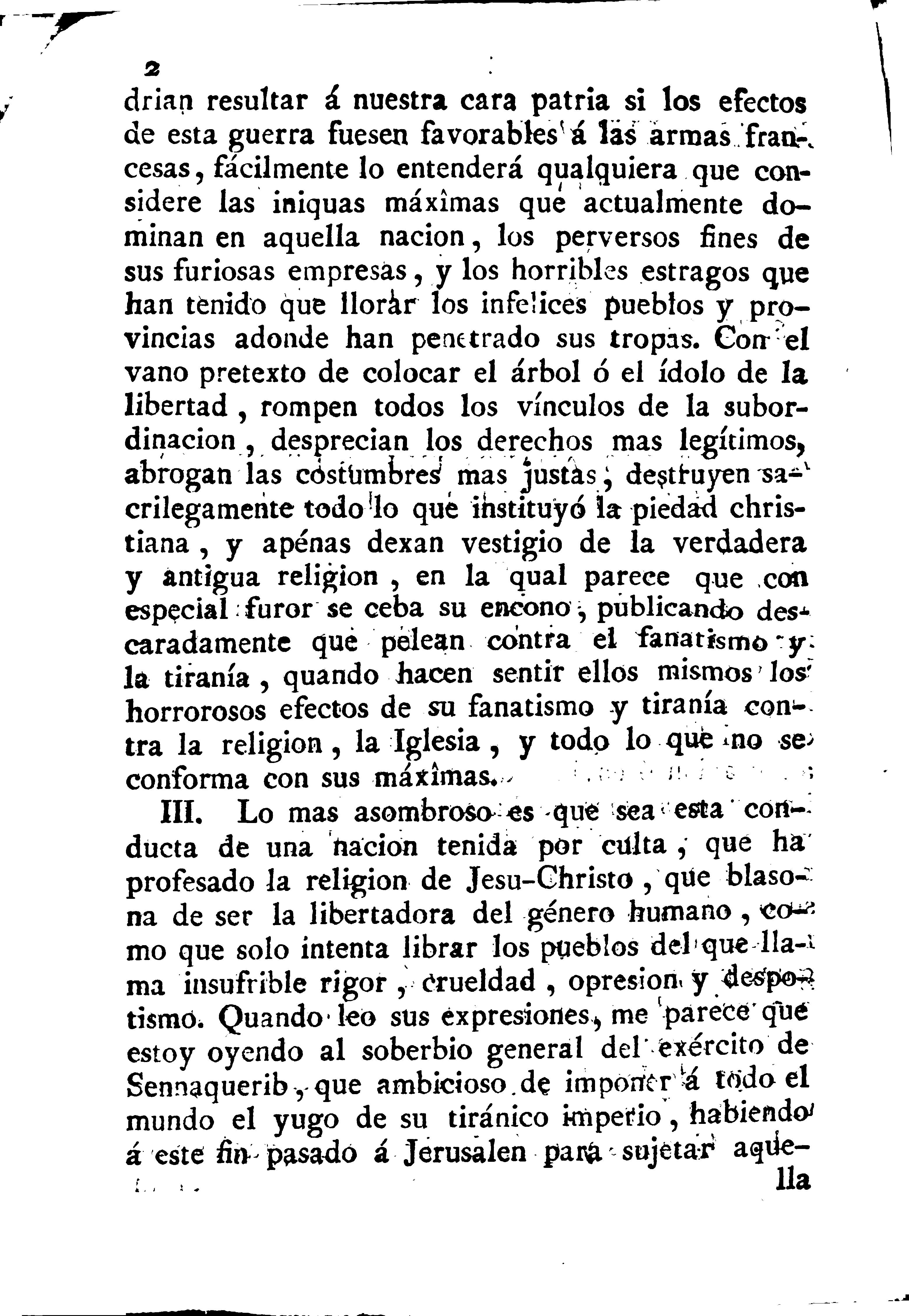 cesas , drian resultar á nuestra cara patria si los efectos de esta guerra fuesen favorables á las armas franfácilmente lo entenderá qualquiera que considere las iniquas máximas que actualmente dominan en aquella nacion , los perversos fines de sus furiosas empresas , y los horribles estragos que han tenido que llorar los infelices pueblos y provincias adonde han penetrado sus tropas. Con el vano pretexto de colocar el árbol ó el ídolo de la libertad , rompen todos los vínculos de la subordinacion , desprecian los derechos mas legítimos, abrogan las costumbres mas justas , destruyen sa crilegamente todo lo que instituyó la piedad christiana , y apénas dexan vestigio de la verdadera y antigua religion , en la qual parece que con especial furor se ceba su encono , publicando descaradamente que pelean contra el fanatismo y la tiranía , quando hacen sentir ellos mismos los horrorosos efectos de su fanatismo y tiranía contra la religion , la Iglesia , y todo lo que no se conforma con sus máximas.