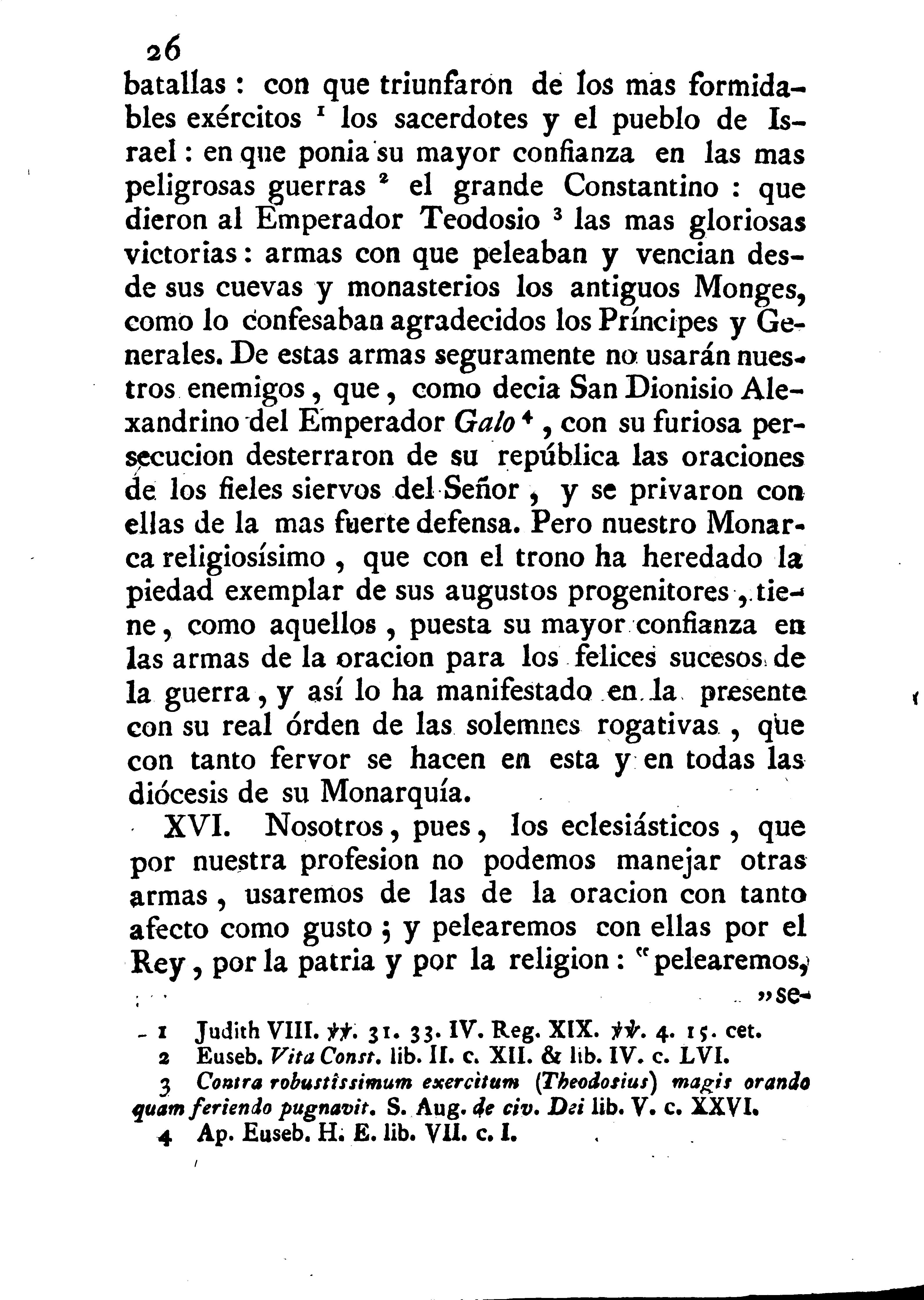 XVI. Nosotros , pues , los eclesiásticos , que por nuestra profesion no podemos manejar otras armas , usaremos de las de la oracion con tanto afecto como gusto ; y pelearemos con ellas por el Rey , por la patria y por la religion : " pelearemos , se-