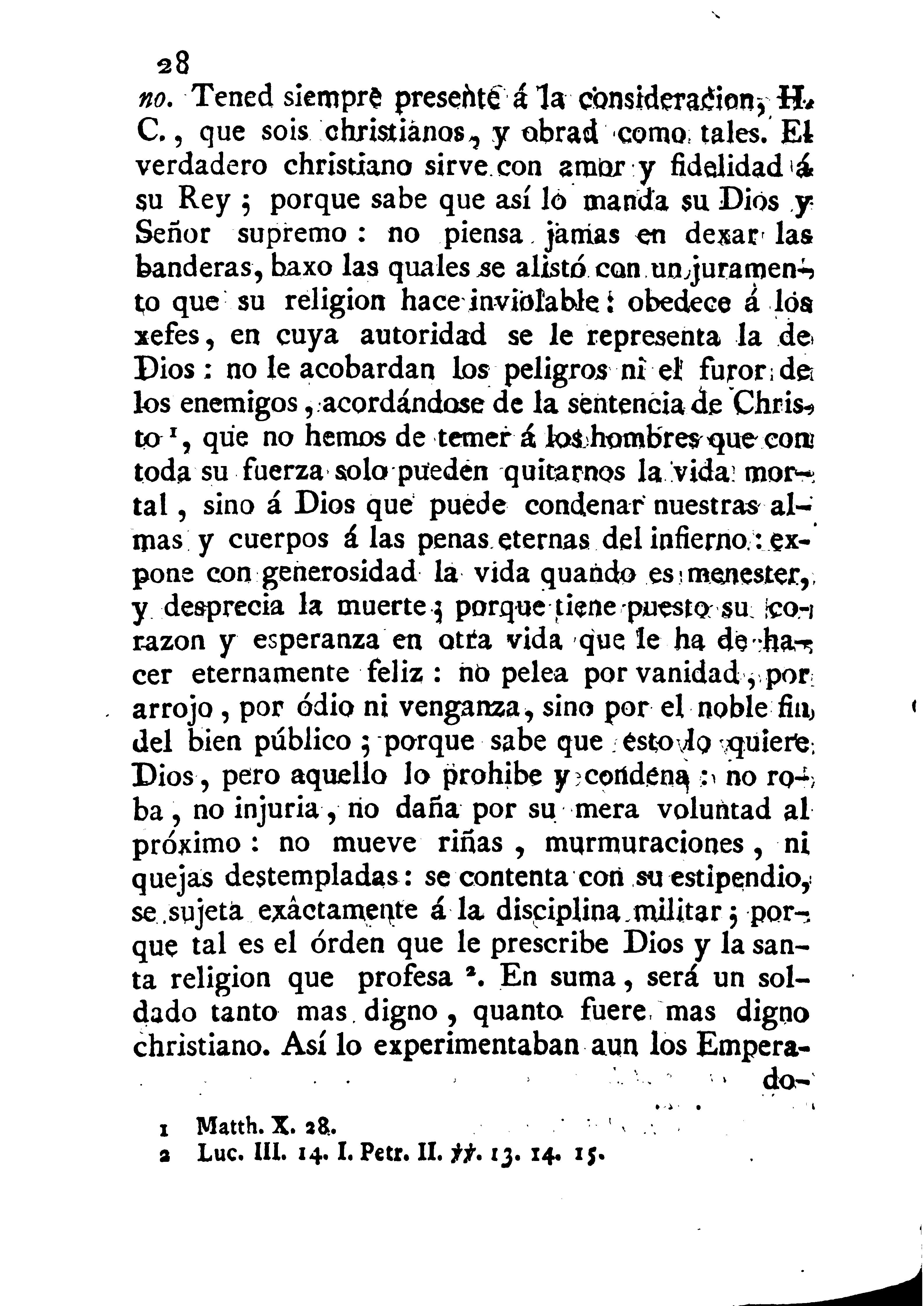 no. Tened siempre presente á la consideracion , H. C. , que sois christianos , y obrad como tales. El verdadero christiano sirve con amor y fidelidad á su Rey ; porque sabe que así lo manda su Dios y Señor supremo : no piensa jamas en dexar las banderas , baxo las quales se alistó con un juramento que su religion hace inviolable : obedece á los xefes , en cuya autoridad se le representa la de Dios no le acobardan los peligros ni el furor de los enemigos , acordándose de la sentencia de Christo , que no hemos de temer á los hombres que con toda su fuerza solo pueden quitarnos la vida mortal , sino á Dios que puede condenar nuestras almas y cuerpos á las penas eternas del infierno : expone con generosidad la vida quando es menester , y desprecia la muerte ; porque tiene puesto su corazon y esperanza en otra vida que le ha de ha cer eternamente feliz no pelea por vanidad , por arrojo , por ódio ni el noble fin venganza , sino por del bien público ; porque sabe que ésto lo quiere; Dios , pero aquello lo prohibe y condena : no roba , no injuria , no daña por su mera voluntad al próximo no mueve riñas , murmuraciones , ni quejas destempladas : se contenta con su estipendio, se sujeta exactamente á la disciplina militar ; porque tal es el órden que le prescribe Dios y la santa religion que profesa 2. En suma , será un soldado tanto mas digno , quanto fuere mas digno christiano . Así lo experimentaban aun los Emperado-