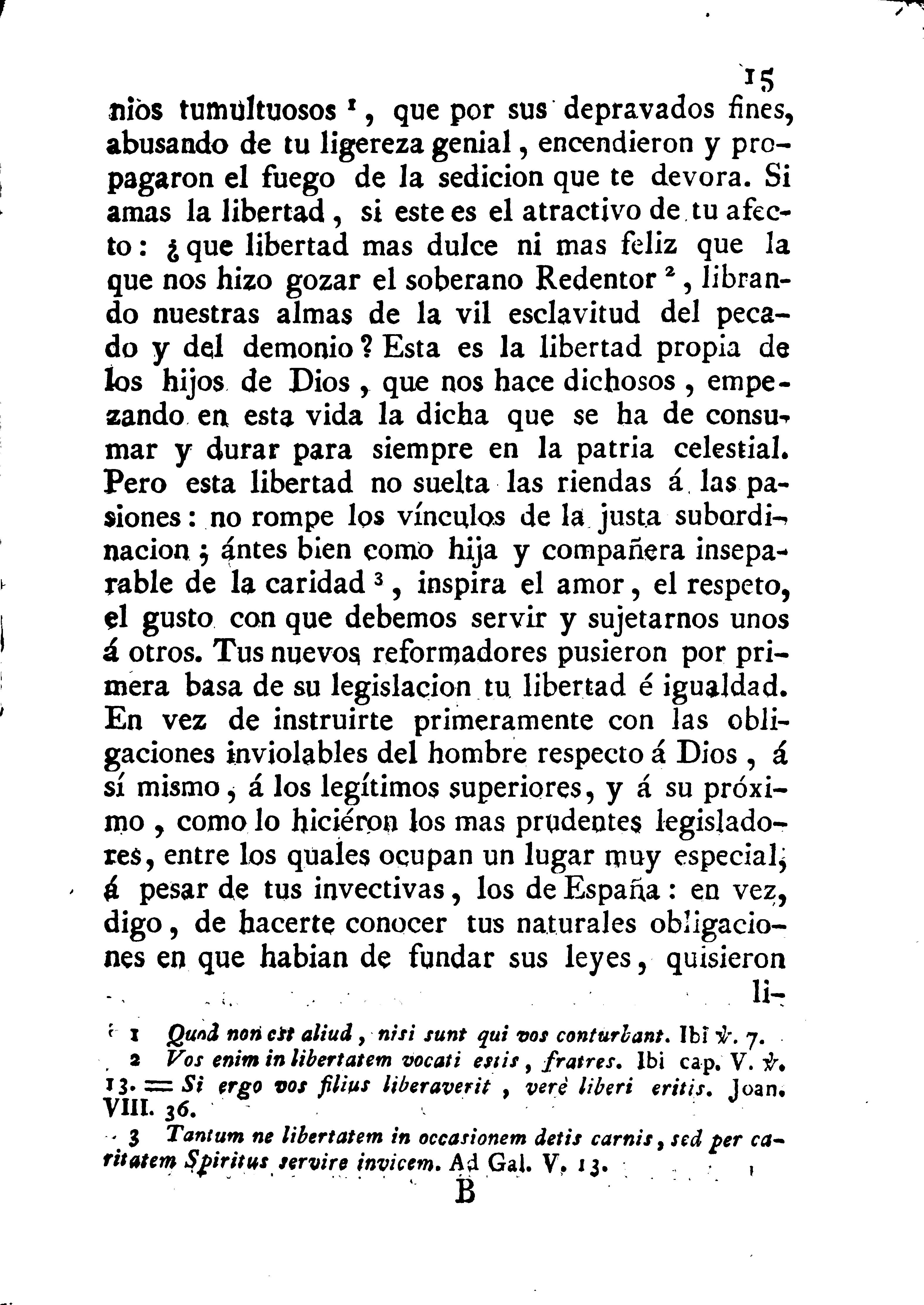 nios tumultuosos , que por sus depravados fines , abusando de tu ligereza genial , encendieron y propagaron el fuego de la sedicion que te devora . Si amas la libertad , si este es el atractivo de tu afecto que libertad mas dulce ni mas feliz que la que nos hizo gozar el soberano Redentor 2 , librando nuestras almas de la vil esclavitud del pecado y del demonio ? Esta es la libertad propia de los hijos de Dios , que nos hace dichosos , empezando en esta vida la dicha que se ha de consumar y durar para siempre en la patria celestial . Pero esta libertad no suelta las riendas á las pasiones no rompe los vínculos de la justa subordi nacion ; ántes bien como hija y compañera inseparable de la caridad 3 , inspira el amor , inspira el amor , el respeto , el gusto con que debemos servir y sujetarnos unos á otros . Tus nuevos reformadores pusieron por primera basa de su legislacion tu libertad é igualdad .
