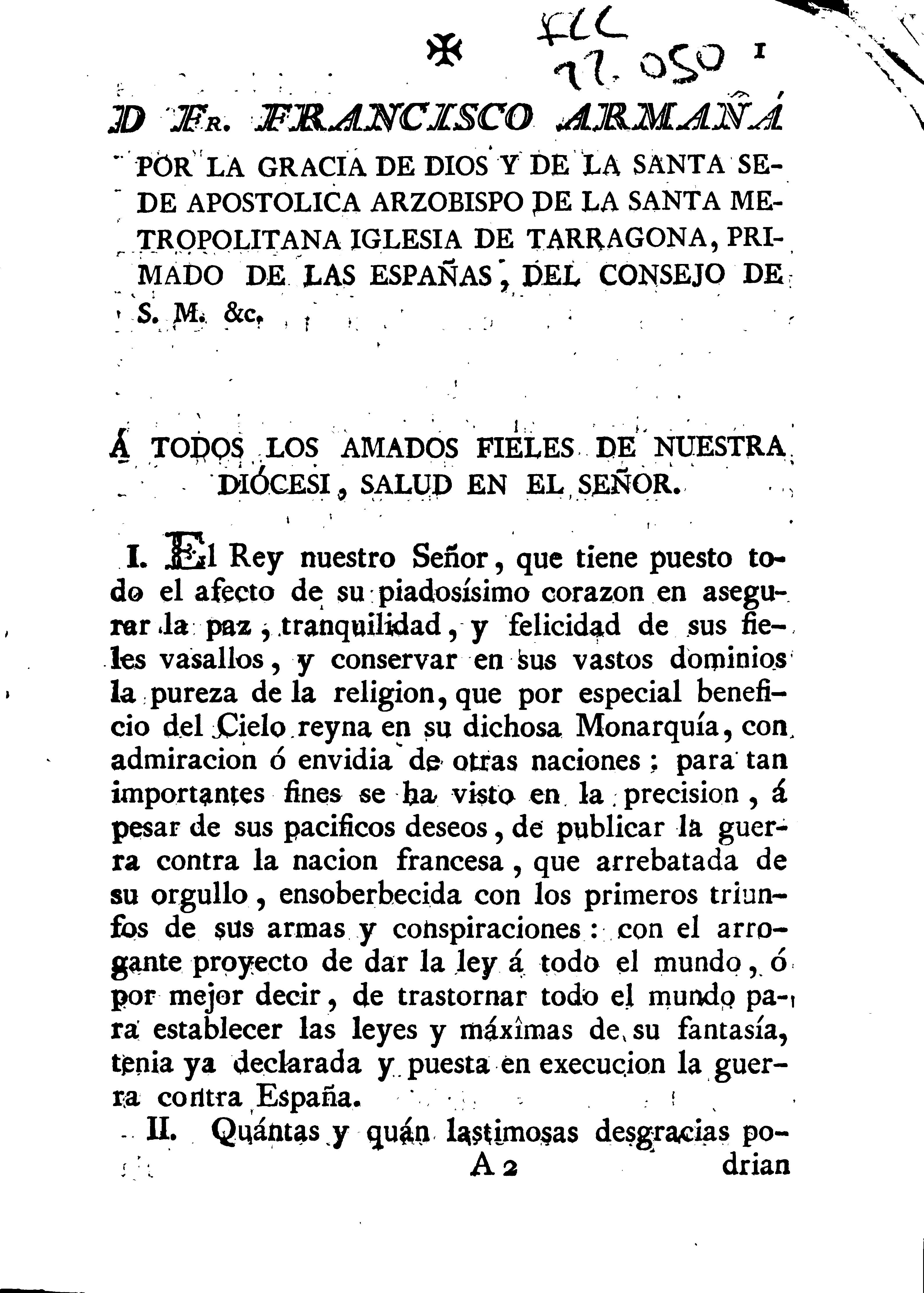 POR LA GRACIA DE DIOS Y DE LA SANTA SEDE APOSTOLICA ARZOBISPO DE LA SANTA METROPOLITANA IGLESIA DE TARRAGONA , PRIMADO DE LAS ESPAÑAS , DEL CONSEJO DE S. M. & c.