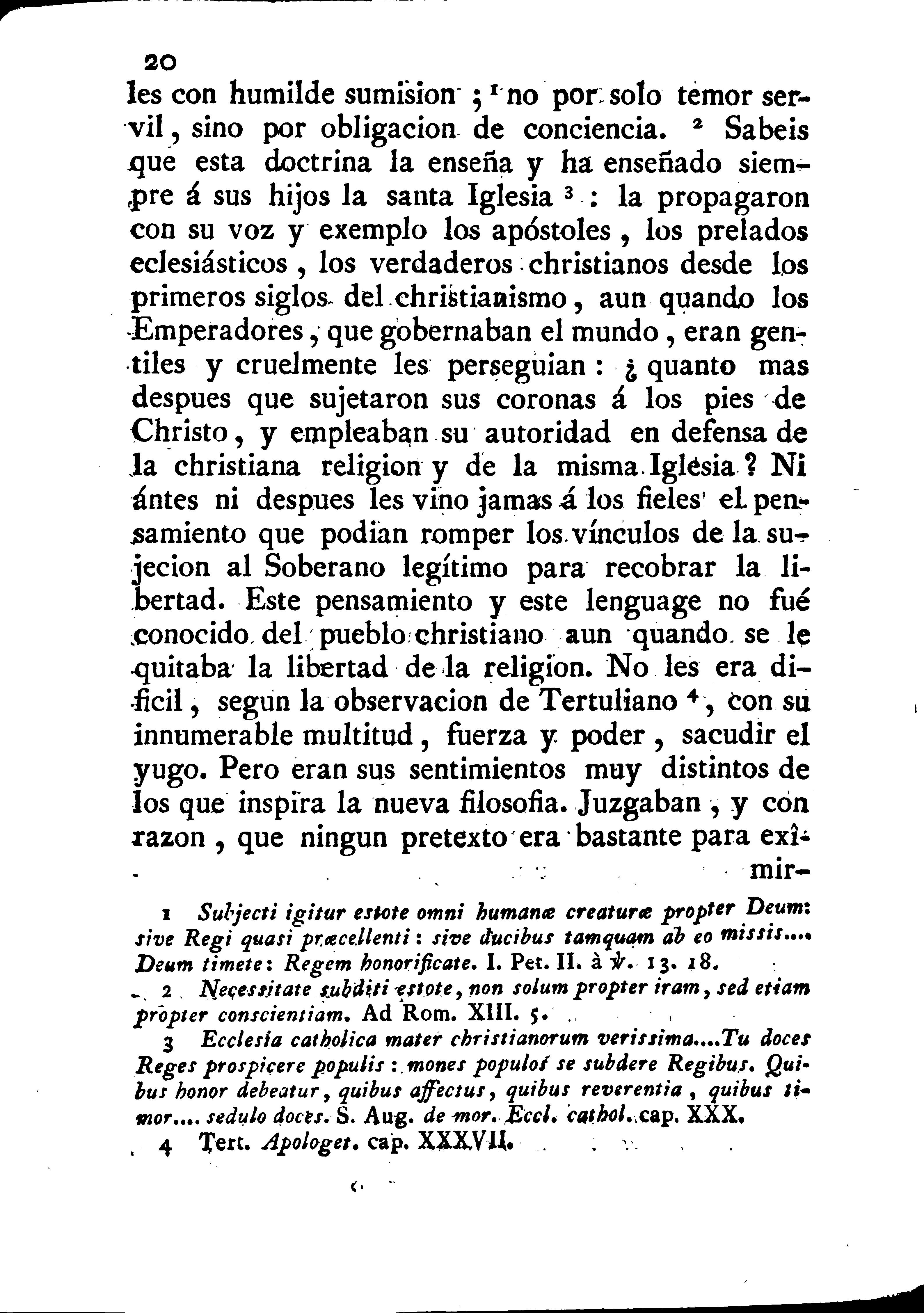 les con humilde sumision ; ' no por solo temor servil , sino por obligacion de conciencia . 2 Sabeis que esta doctrina la enseña y ha enseñado siempre á sus hijos la santa Iglesia 3 : la propagaron con su voz y exemplo los apóstoles , los prelados eclesiásticos , los verdaderos christianos desde los primeros siglos del christianismo , aun quando los Emperadores , que gobernaban el mundo , eran gentiles y cruelmente les perseguian : quanto mas despues que sujetaron sus coronas á los pies de Christo , y empleaban su autoridad en defensa de la christiana religion y de la misma Iglesia ? Ni ántes ni despues les vino jamas á los fieles el pensamiento que podian romper los vínculos de la su jecion al Soberano legítimo para recobrar la libertad. Este pensamiento y este lenguage no fué conocido del pueblo christiano aun quando se le quitaba la libertad de la religion. No les era dificil , segun la observacion de Tertuliano 4 , con su innumerable multitud , fuerza y poder , sacudir el yugo. Pero eran sus sentimientos muy distintos de los que inspira la nueva filosofia . Juzgaban , y con razon , que ningun pretexto era bastante para exîmir-