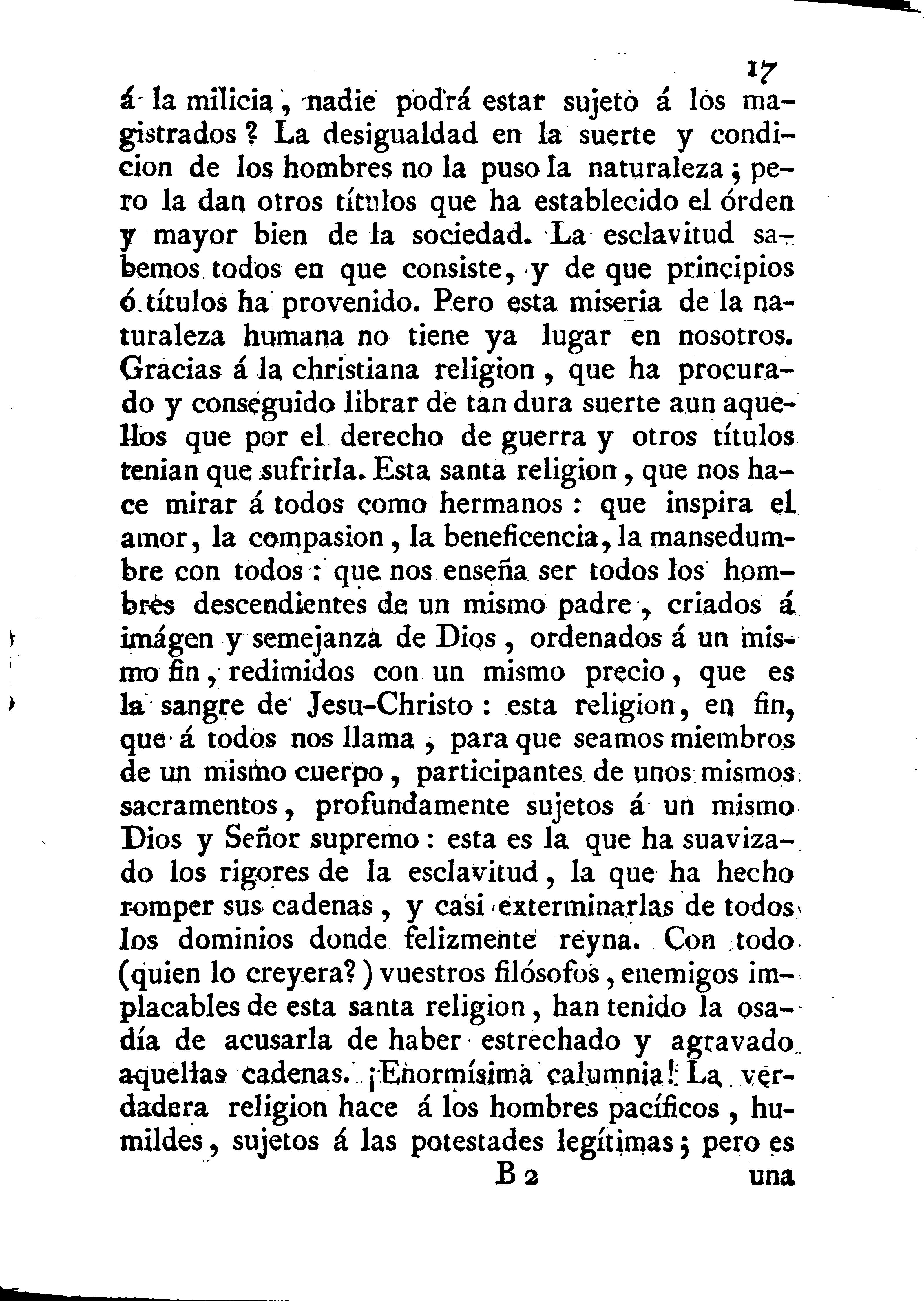 á la milicia , nadie podrá estar sujetò á los magistrados ? La desigualdad en la suerte y condicion de los hombres no la puso la naturaleza ; pero la dan otros títulos que ha establecido el órden y mayor bien de la sociedad . La esclavitud sabemos todos en que consiste , y de que principios ó títulos ha provenido . Pero esta miseria de la naturaleza humana no tiene ya lugar en nosotros. Gracias á la christiana religion , que ha procurado y conseguido librar de tan dura suerte aun aquellos que por el derecho de guerra y otros títulos tenian que sufrirla . Esta santa religion , que nos hace mirar á todos como hermanos : que inspira el amor , la compasion , la beneficencia , la mansedumbre con todos que nos enseña ser todos los hombrés descendientes de un mismo padre , criados á imágen y semejanza de Dios , ordenados á un mismo fin , redimidos con un mismo precio , que es la sangre de Jesu-Christo : esta religion , en fin , que á todos nos llama , para que seamos miembros de un mismo cuerpo , participantes de unos mismos sacramentos , profundamente sujetos á un mismo Dios y Señor supremo : esta es la que ha suavizado los rigores de la esclavitud , la que ha hecho romper sus cadenas , y casi exterminarlas de todos los dominios donde felizmente reyna . Con todo (quien lo creyera ? ) vuestros filósofos , enemigos implacables de esta santa religion , han tenido la osadía de acusarla de haber estrechado y agravado aquellas cadenas . ¡ Enormísima calumnia ! La verdadera religion hace á los hombres pacíficos , humildes , sujetos á las potestades legítimas ; pero es B2 una 1
