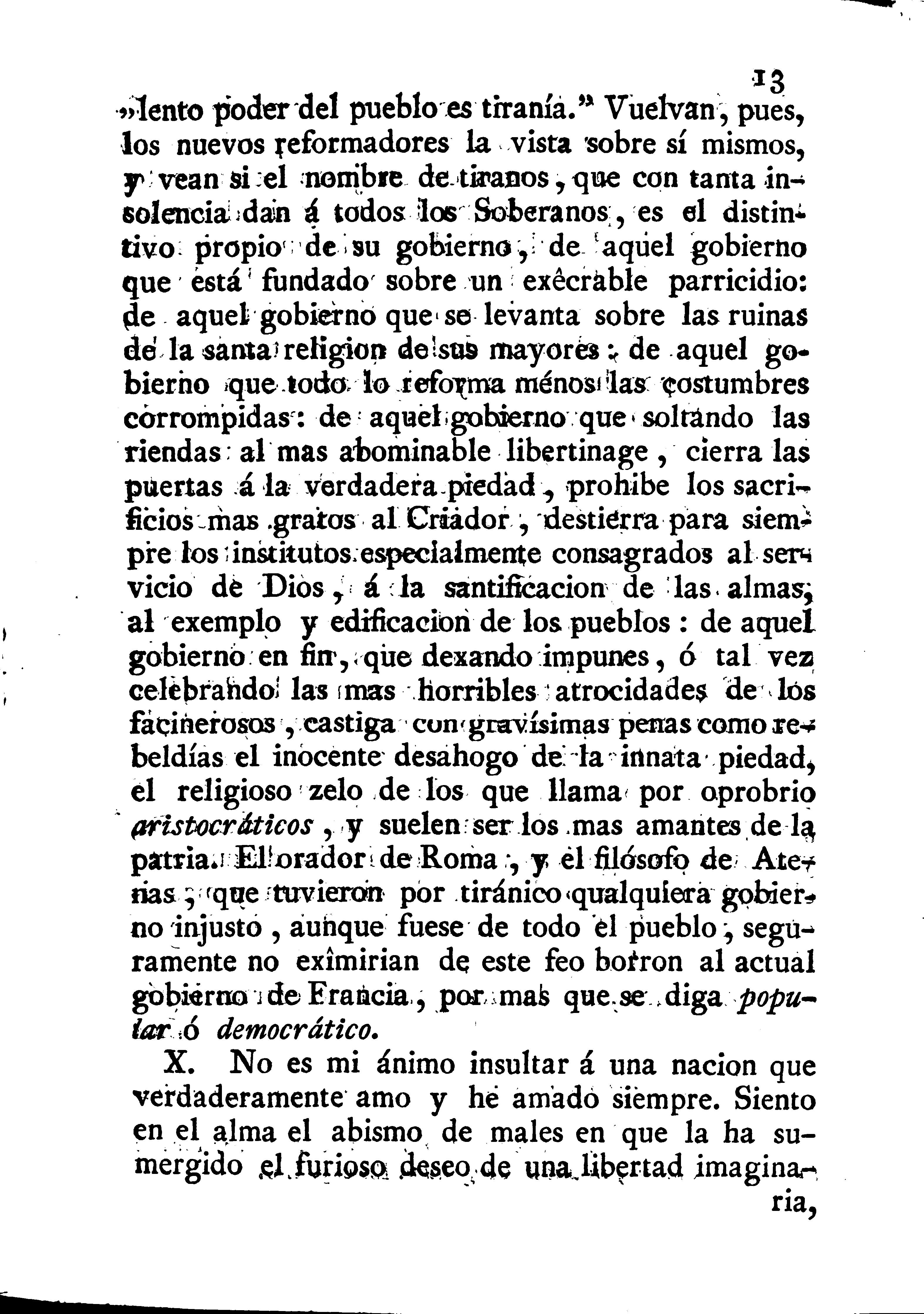 X. No es mi ánimo insultar á una nacion que verdaderamente amo y he amado siempre . Siento en el alma el abismo de males en que la ha sumergido el furioso deseo de una libertad imaginaria ,