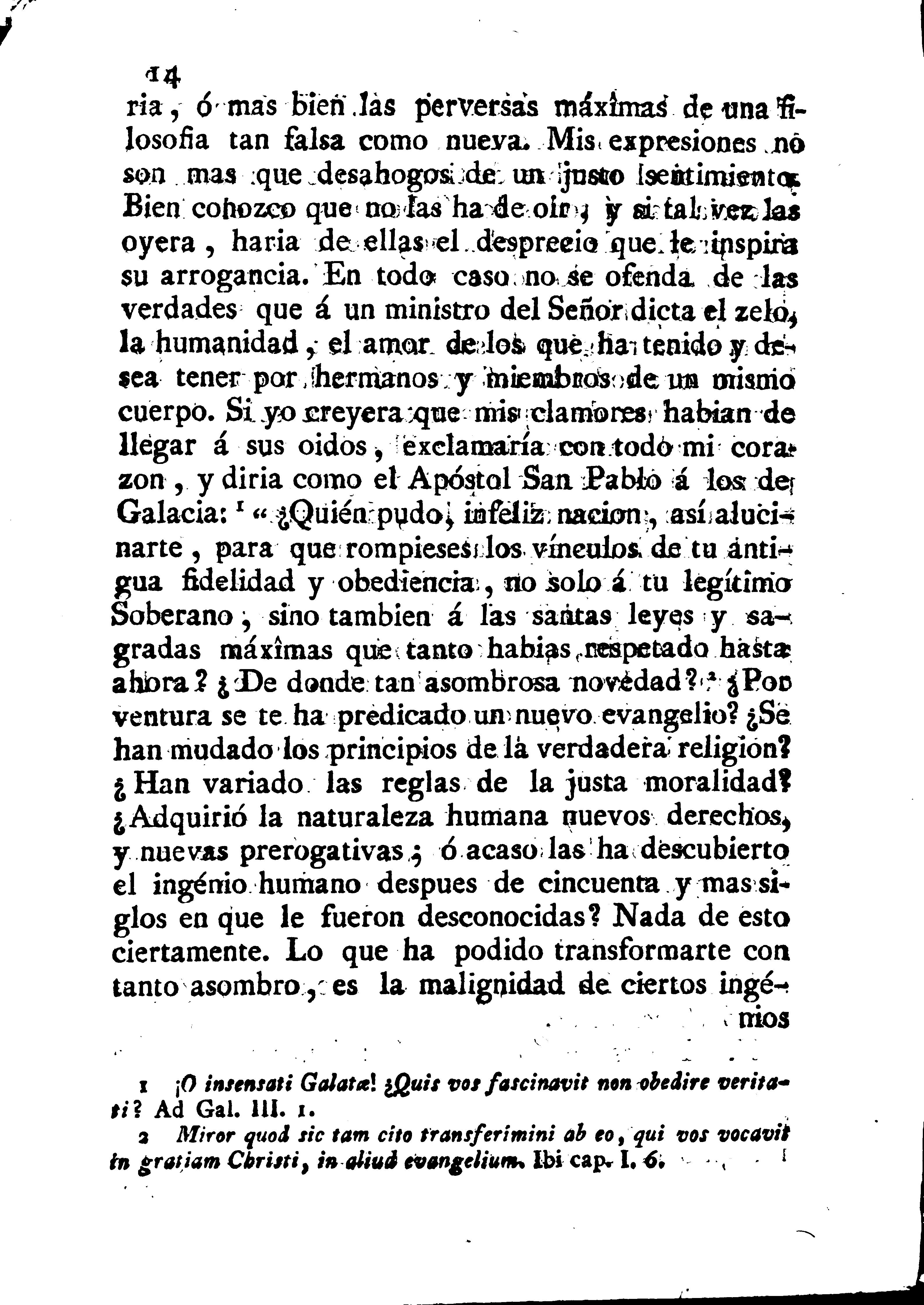 ria , ó mas bien las perversas máximas de una filosofia tan falsa como nueva. Mis expresiones no son mas que desahogos de un justo Isentimiento. Bien conozco que no las ha de oir, y si talvez las oyera , haria de ellas el desprecio que le inspira su arrogancia . En todo caso no se ofenda de las verdades que á un ministro del Señor dicta el zelo, la humanidad , el amor de los que ha tenido y desea tener por hermanos y miembros de un mismo cuerpo . Si yo creyera que mis clamores habian de llegar á sus oidos , exclamaría con todo mi cora zon , y diria como el Apóstol San Pablo á los de Galacia: « ¿Quién pudo , infeliz nacion , así alucinarte , para que rompieses los vínculos de tu antigua fidelidad y obediencia , no solo á tu legítimo Soberano , sino tambien á las santas leyes y sagradas máximas que tanto habias respetado hasta ahora ? ¿ De donde tan asombrosa novedad ? ² Por ventura se te ha predicado un nuevo evangelio? ¿Se han mudado los principios de la verdadera religion?