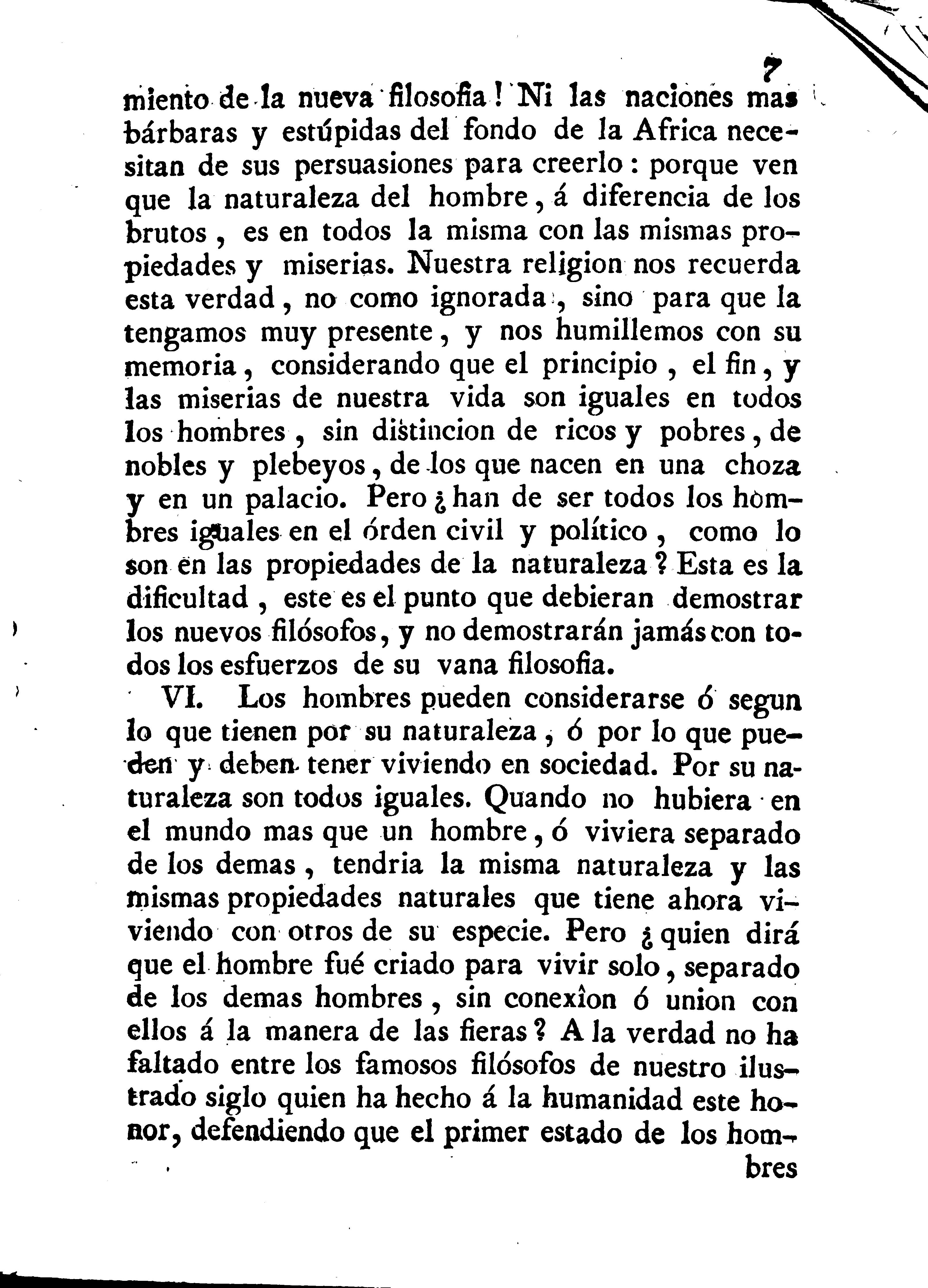lisonjear tu vanidad y fomentar tu orgullo con los derechos y prerogativas del hombre , dando principio á su nuevo código con la grande máxima de que todos nacemos libres , y que por tanto somos todos iguales . Esta máxima que con tanta hinchazon han publicado , nada tiene de nuevo sino la perversa aplicacion . Los antiguos filósofos y jurisconsultos dixeron expresamente , ' que los hombres nacen todos libres , y que deben considerarse todos como iguales . Pero la libertad , con que segun ellos nacemos todos , es la que nos distingue de los verdaderos esclavos : la igualdad universal es la que nos da la naturaleza , por la qual somos todos de una misma condicion : es decir , que por solos principios de la naturaleza nadie es esclavo , nadie es de peor condicion que otro. Y esto ¿ quien lo niega ? ¿ Por ventura en las naciones donde gobierna un Monarca , se piensa que sus súbditos nácen esclavos , ó son por su naturaleza de peor condicion ? ¿ Por ventura soñaron jamas este disparate los potentados , los legítimos superiores , los nobles , los de distinguida clase ? ¿ Hay alguno que ignore que la desigualdad de condiciones no viene por principios de naturaleza , sino por ciertas leyes , derechos ó costumbres , que ha confirmado una larga posesion ? Por la naturaleza no somos ricos ni pobres , no somos amos ni criados , no somos paysanos ni soldados , no somos magistrados ni súbditos : ¿ por esto nadie podrá enriquecerse , nadie podrá tener criados , nadie podrá obligarse