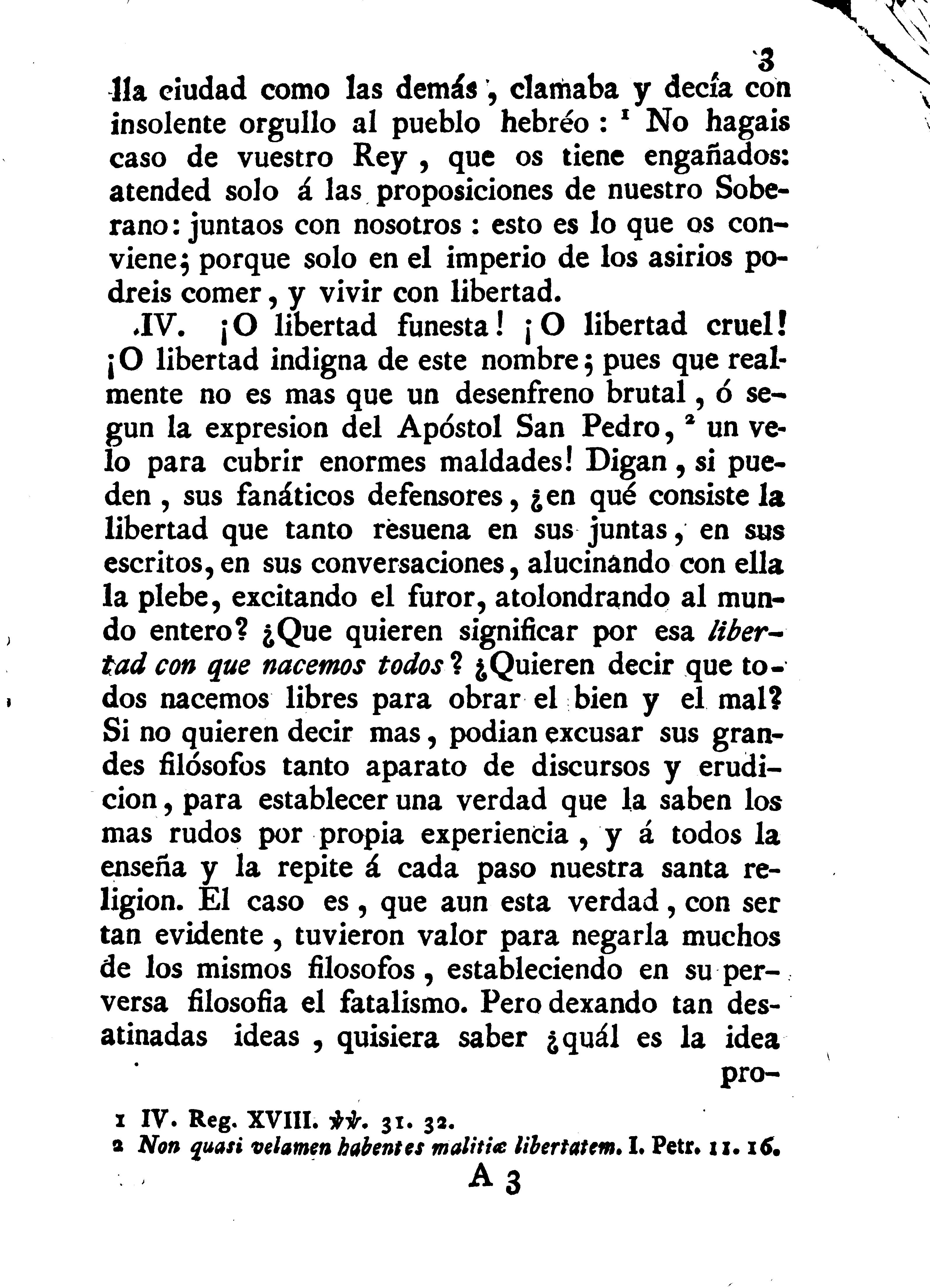 IV. ¡ O libertad funesta ! ¡ O libertad cruel ! ¡ O libertad indigna de este nombre ; pues que realmente no es mas que un desenfreno brutal , ó segun la expresion del Apóstol San Pedro , un velo para cubrir enormes maldades ! Digan , si pueden , sus fanáticos defensores , ¿ en qué consiste la libertad que tanto resuena en sus juntas , en sus escritos , en sus conversaciones , alucinando con ella la plebe , excitando el furor , atolondrando al mundo entero ? ¿ Que quieren significar por esa libertad con que nacemos todos ? ¿ Quieren decir que todos nacemos libres para obrar el bien y el mal ? Si no quieren decir mas , podian excusar sus grandes filósofos tanto aparato de discursos y erudicion , para establecer una verdad que la saben los mas rudos por propia experiencia , y á todos la enseña y la repite á cada paso nuestra santa religion. El caso es , que aun esta verdad , con ser tan evidente , tuvieron valor para negarla muchos de los mismos filosofos , estableciendo en su perversa filosofia el fatalismo . Pero dexando tan desatinadas ideas , quisiera saber ¿ quál es la idea