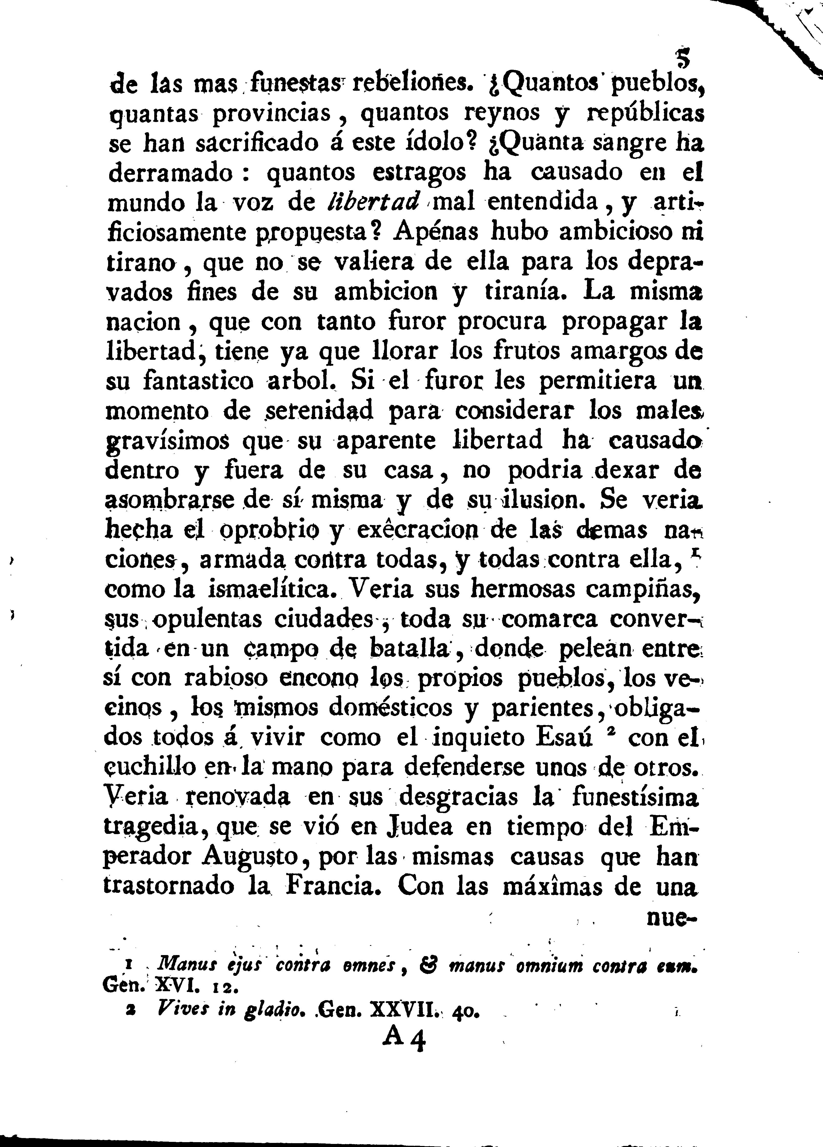 5 de las mas funestas rebeliones. ¿ Quantos pueblos , quantas provincias , quantos reynos y repúblicas se han sacrificado á este ídolo ? ¿ Quanta sangre ha derramado : quantos estragos ha causado en el mundo la voz de libertad mal entendida , y arti ficiosamente propuesta ? Apénas hubo ambicioso ni tirano , que no se valiera de ella para los depravados fines de su ambicion y tiranía . La misma nacion , que con tanto furor procura propagar la libertad , tiene ya que llorar los frutos amargos de su fantastico arbol . Si el furor les permitiera un momento de serenidad para considerar los males gravísimos que su aparente libertad ha causado dentro y fuera de su casa , no podria dexar de asombrarse de sí misma y de su ilusion . Se veria hecha el oprobrio y exêcracion de las demas naciones , armada contra todas , y todas contra ella , 5 como la ismaelítica . Veria sus hermosas campiñas , sus opulentas ciudades , toda su comarca convertida en un campo de batalla , donde pelean entre sí con rabioso encono los propios pueblos , los vecinos , los mismos domésticos y parientes , obligados todos á vivir como el inquieto Esaú 2 con el cuchillo en la mano para defenderse unos de otros . Veria renovada en sus desgracias la funestísima tragedia , que se vió en Judea en tiempo del Emperador Augusto , por las mismas causas que han trastornado la Francia . Con las máximas de una