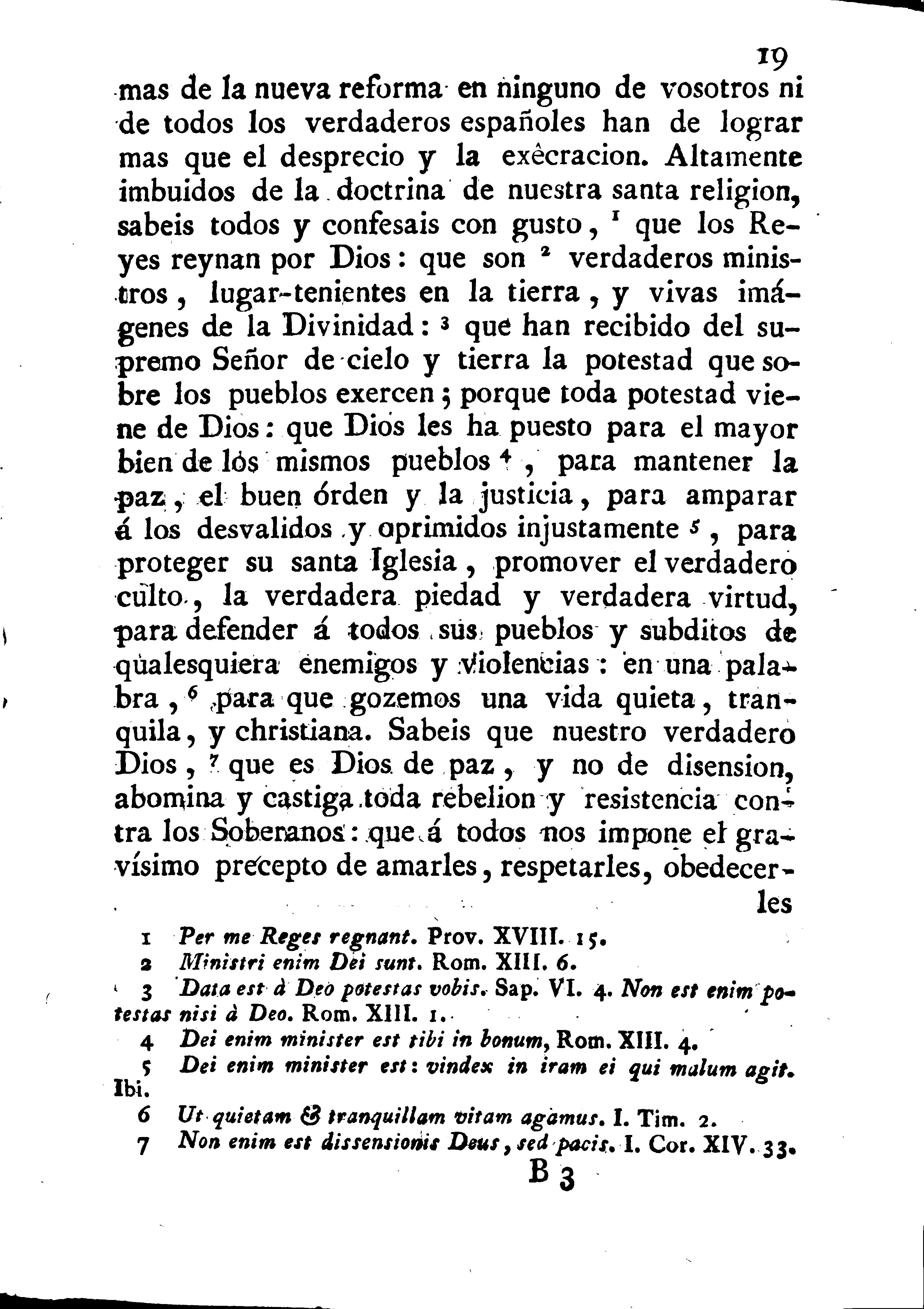mas de la nueva reforma en ninguno de vosotros ni de todos los verdaderos españoles han de lograr mas que el desprecio y la exêcracion. Altamente imbuidos de la doctrina de nuestra santa religion , sabeis todos y confesais con gusto que los Reyes reynan por Dios : que son 2 verdaderos ministros lugar- tenientes en la tierra , y vivas imágenes de la Divinidad : 3 que han recibido del supremo Señor de cielo y tierra la potestad que sobre los pueblos exercen ; porque toda potestad viene de Dios : que Dios les ha puesto para el mayor bien de los mismos pueblos , para mantener la paz , el buen órden y la justicia , para amparar á los desvalidos y oprimidos injustamente 5 , para proteger su santa Iglesia , promover el verdadero culto , la verdadera piedad y verdadera virtud , para defender á todos sus pueblos y subditos de qualesquiera enemigos y violencias en una palabra , 6 para que gozemos una vida quieta , tranquila , y christiana . Sabeis que nuestro verdadero Dios , que es Dios de paz , y no de disension , abomina y castiga toda rebelion y resistencia contra los Soberanos : que á todos nos impone el gravísimo precepto de amarles , respetarles , obedecerles