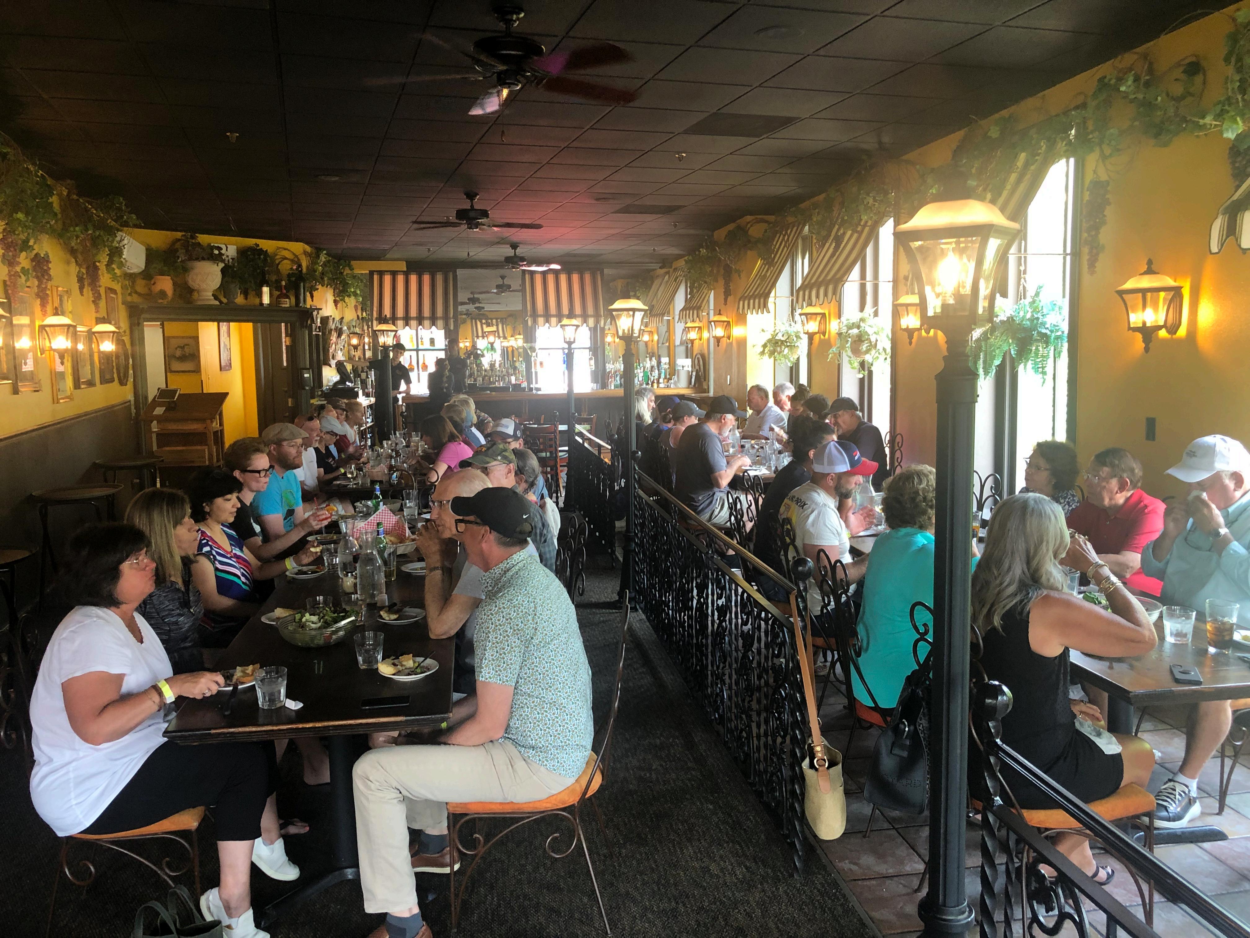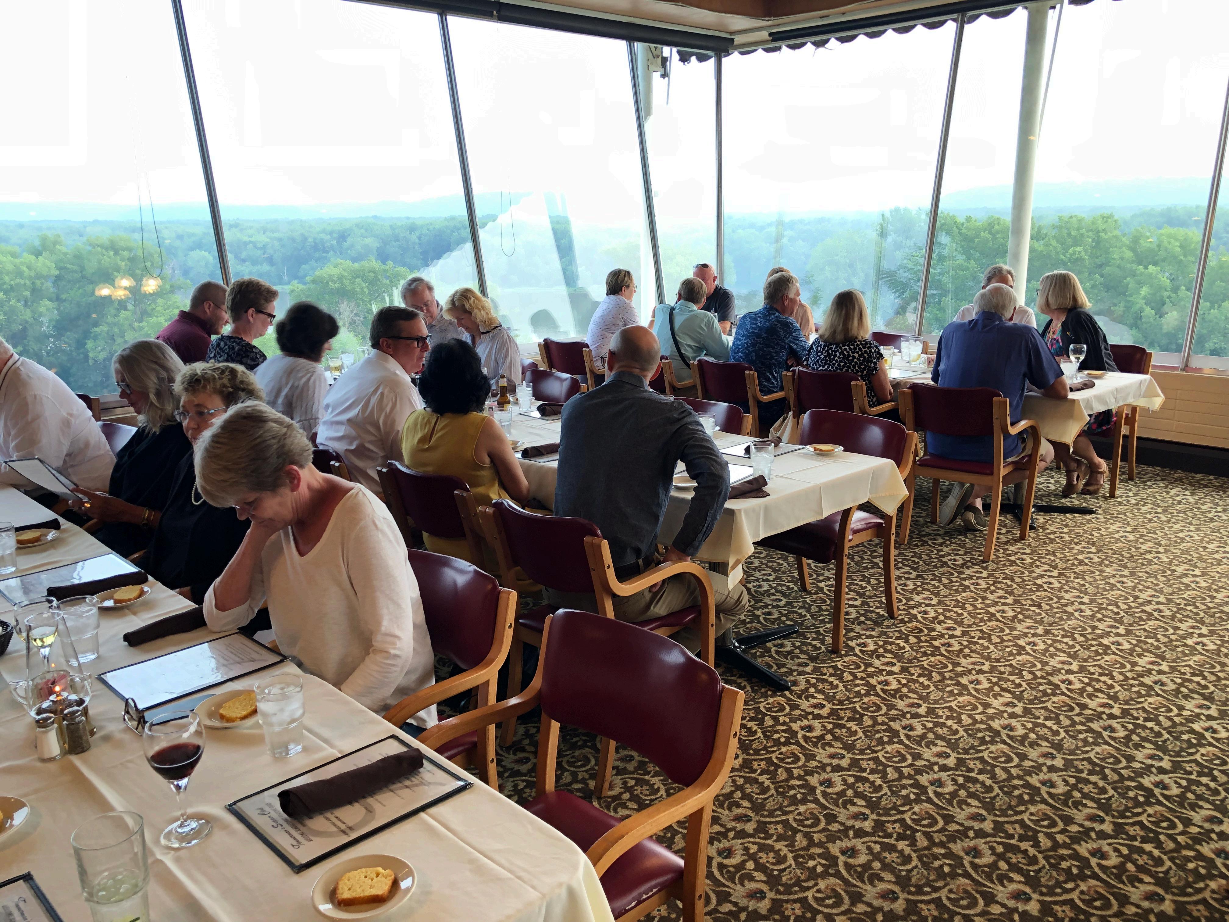 The Hotel Julien was the perfect launch pad for the tour. Above, Social Chair Belinda and Ben Nordman look ready for the days drive. Sight seeing included Poopy’s Bar (believe me, it was a sight to see), and the lock and dam at Bellevue. Below, our final dinner at Timmerman’s overlooking the Mississippi.