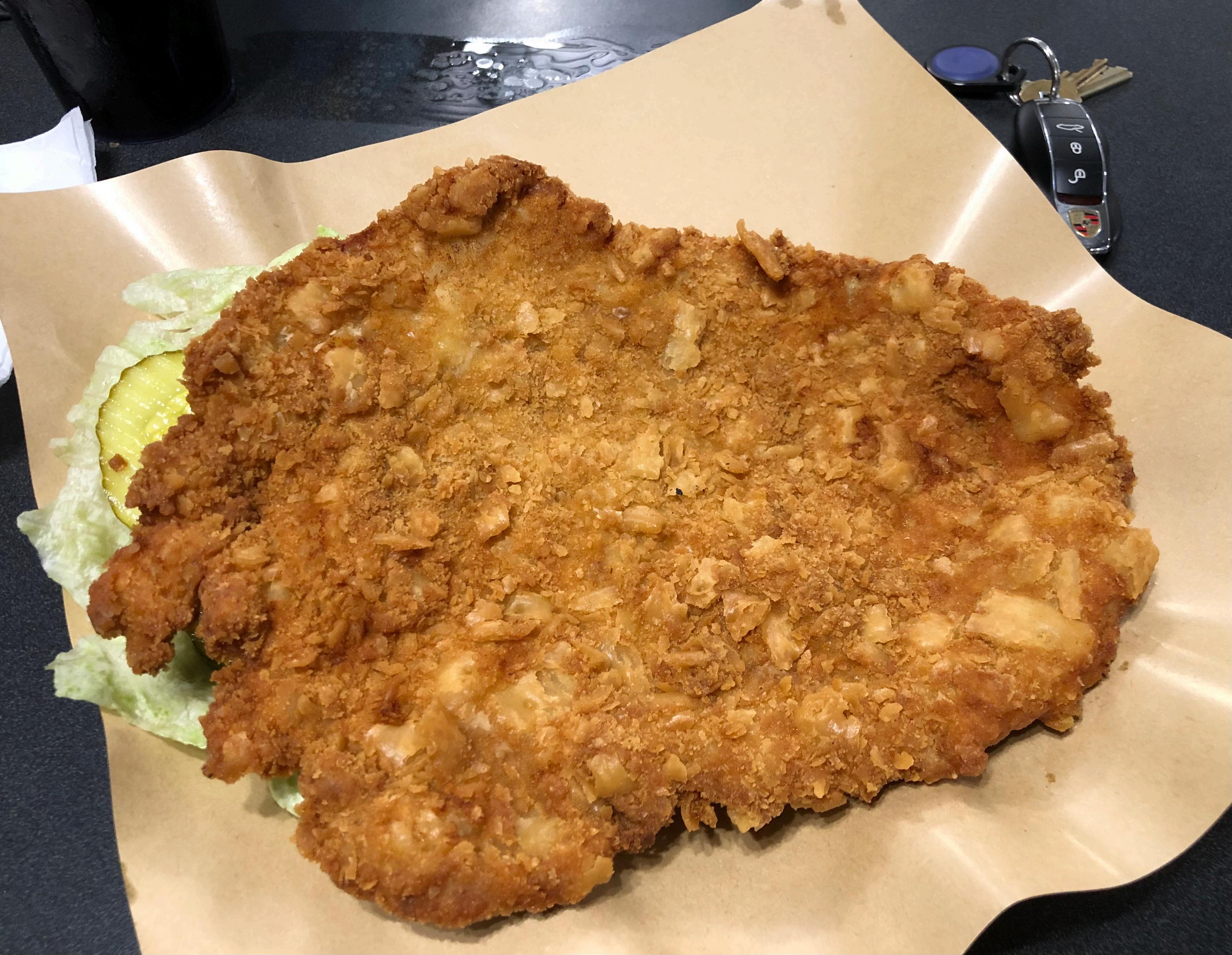 Left photo: No sign. No problem. When your tenderloin is that big, a restaurant doesn’t need to advertise. The bottom photo is their famous tenderloin. A ginormous piece of pounded pork on a bun. You say you can’t see the bun? Well, you can’t see the plate it’s on either.