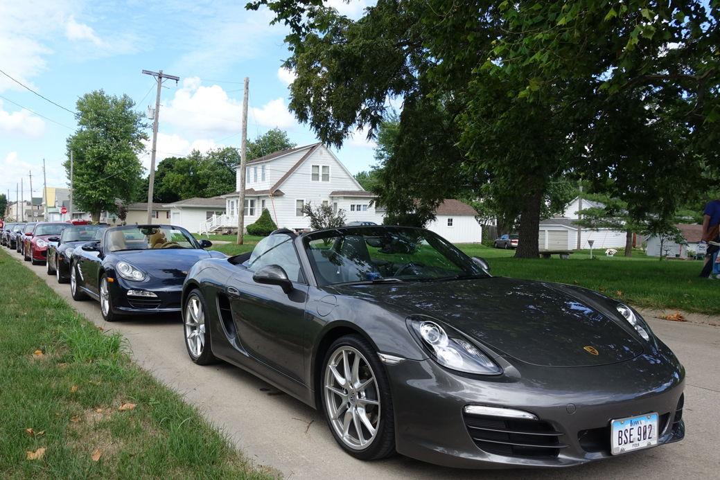 To the left: Cars staged in Altoona while Trail Boss Jim Baker gives instructions on the upcoming day. For those who have a keen eye, you will notice something different in these photos. It’s blue sky. Yes, the curse of Schonesland bad weather is broken. Let’s hope it holds for the rest of the year.