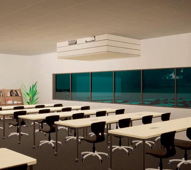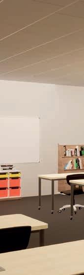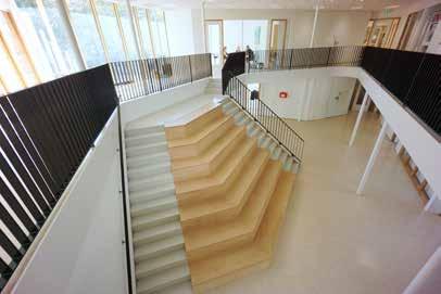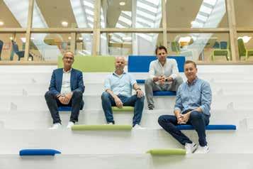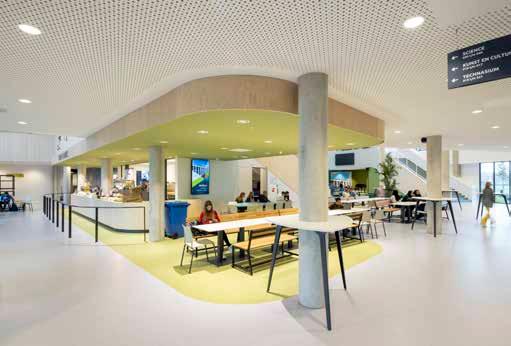 aanzetten tot beweging. Ook de enquêtes onder stafmedewerkers, docenten en studenten lieten zien dat mensen willen bewegen tijdens hun werk: zitten en staan makkelijk afwisselen, staand of zelfs wandelend over de boulevards overleggen. Naast in hoogte verstelbare tafels hebben we dynamische deskbikes, stahulpen en swoppers in de meubelmix opgenomen.” In het design van de inrichting zie je welzijn in vele aspecten terug. Zo is de akoestiek optimaal dankzij inzet van gordijnen, panelen met vilt en visuals met akoestisch materiaal. Ook planten verhogen het welbevinden, net als het kleurgebruik: rustige blauw- en groentinten.