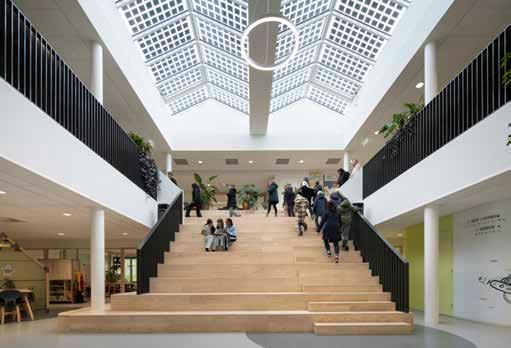 Door het gebruik van hout en natuurlijke kleuren ademt de school rust. Er komt bovendien op een heel natuurlijke manier daglicht binnen. Dat is heel belangrijk, want licht doet zo veel voor kinderhersenen.” Het Montessorionderwijs dat in De Wijde Wereld wordt gegeven ziet Mandy terug in de uitstraling en indeling van het gebouw. “Er zijn geen schotten in de school, alle ruimtes stimuleren samenwerking en ontmoeting en er is een goede verbinding tussen binnen en buiten. Die vertaalslag naar het Montessorionderwijs is hier heel goed gelukt.”