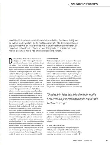 e faculteit der Wiskunde en Natuurwetenschappen in het Bio Sciencepark in Leiden wordt fors verbouwd. Hoofd facilitaire dienst Ton Bakker: “Onze facilitaire dienst is decentraal binnen de Universiteit Leiden georganiseerd omdat wij ten opzichte van de overige faculteiten een afwijkende werkomgeving hebben. Mijn medewerkers hebben nagenoeg allemaal een laboratoriumachtergrond en moeten bijvoorbeeld met chemisch afval kunnen werken. De wetenschap ontwikkelt zich in hoog tempo en daarmee wordt het studeren en opleiden van mensen anders. De panden uit 1967 zijn verouderd en onderhoud en de aanwezigheid van asbest dwongen ons tot de keuze; saneren of slopen en nieuwbouw. Wij hebben gekozen voor het laatste, omdat je dan beter kunt inspelen op nieuwe ontwikkelingen. We bouwen de nieuwe faculteit in 3 fasen en de eerste fase is net afgerond. De ontwikkeling tweede fase is nu gaande en uiteindelijk worden alle bouwdelen aan elkaar verbonden. Nieuwbouw van een faculteit als die van ons is complex vanwege de diversiteit aan laboratoria die je nodig hebt. Je vindt hier alleen al vier soorten water in het pand: bedrijfswater, drinkwater, proces koelwater en demiwater. Er lopen honderden meters speciaal gas-, stikstof- en heliumleidingen door het pand, diverse soorten stroomvoorzieningen die oplopen tot 64Amp en het pand is voorzien van een uiterst geavanceerde luchthuishouding. Er zijn verschillende meethallen welke zijn voorzien van trillingsvrije eilanden die op spiraalveren of luchtkussens staan, vanwege de trillingsgevoeligheid. Zelfs de golfslag aan de kust kan door sommige uiterst gevoelige opstellingen worden waargenomen. Wetenschappelijk onderzoek is de laatste jaren steeds verder ontwikkeld.