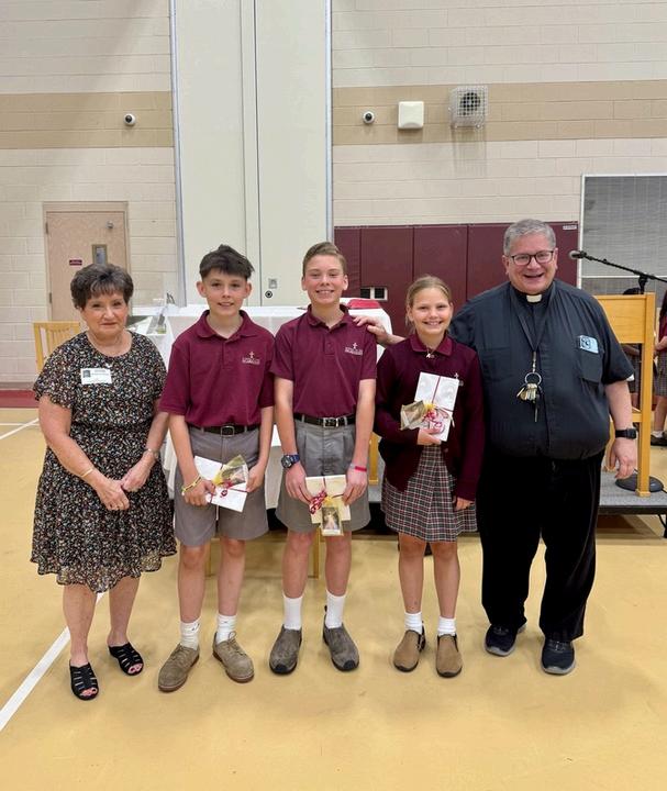 Pictured are last year’s winners with School Board Chair, Millie DeSimone, and Msgr Rob