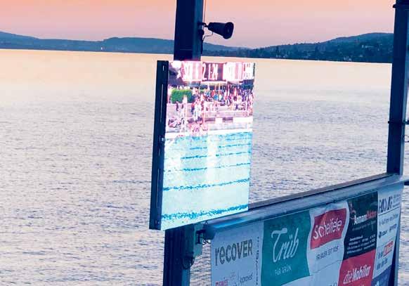 Wie fast in der Swiss Life Arena beim ZSC hat jetzt auch der Schwimmclub Horgen eine gigantische LED-Anzeige erhalten. Zuerst wollte man diese direkt über dem Spielfeld mit einer neuartigen Stahlkonstruktion platzieren, doch diese hätte den «faradayschen Käfig», um die Blitze abzuleiten, durcheinander gebracht und für ein Sicherheitsrisiko gesorgt. So hat sich die Gemeinde nach mehrtägigen Sitzungen und akribischen Analysen (schon fast wie bei der Standortevaluation vom Hallenbad) entschieden, die Videowand am selben Ort wie früher, an einem der Pfeiler anzubringen. Die Anzeige verspricht einige Vorteile. So kann man darauf nicht nur das Resultat sehen, sondern auch die Anzahl und Ausstellungen der Spie-