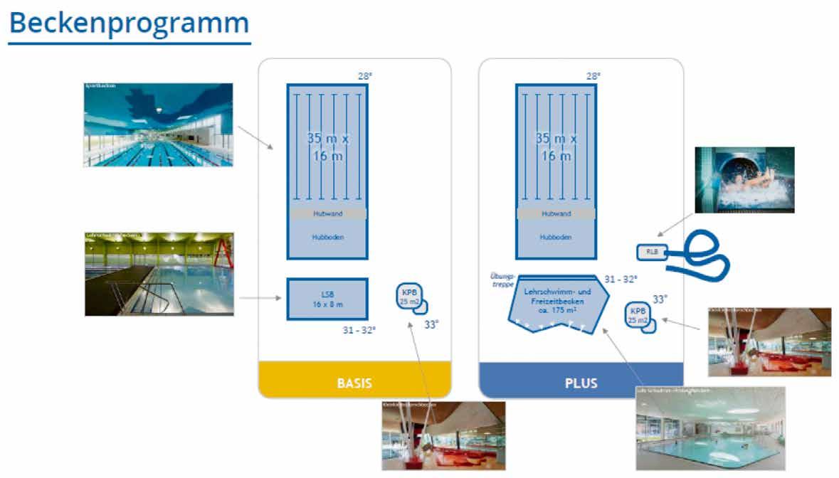 Geplant ist ein Hybrid-Sportbecken, das 35 m lang, 16 m breit ist und 6 Bahnen hat. Dies mit einer flexiblen Wand, die einen 25-m-Bereich und eine Restfläche unterteilen. Dazu kommen ein Lehrschwimmbecken, entweder 16x8 m oder ein etwas grösseres Freizeitbecken mit ca. 176 m2 Weiter wird es ein Kinderplanschbecken mit 25 m2 und je nach Variante allenfalls sogar eine Rutschbahnanlage haben.